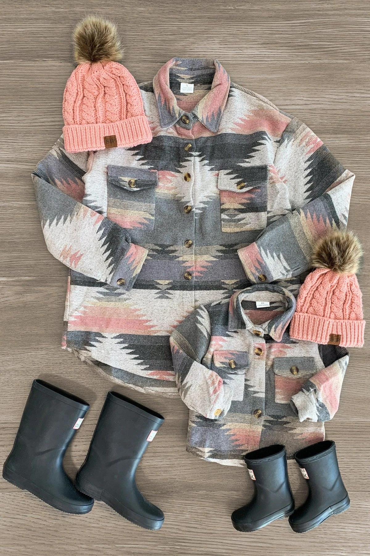 Twinning is winning this season! These Gray & Pink Southwestern Shackets feature long sleeves and an allover gray & pink southwestern pattern. This cozy shirt jacket is made from a thick, flannel-like material that will keep her warm & comfy during all adventures. She can pair it with a variety of SIP bottoms & our booties for the perfect look! Little ones love to match their mommy!