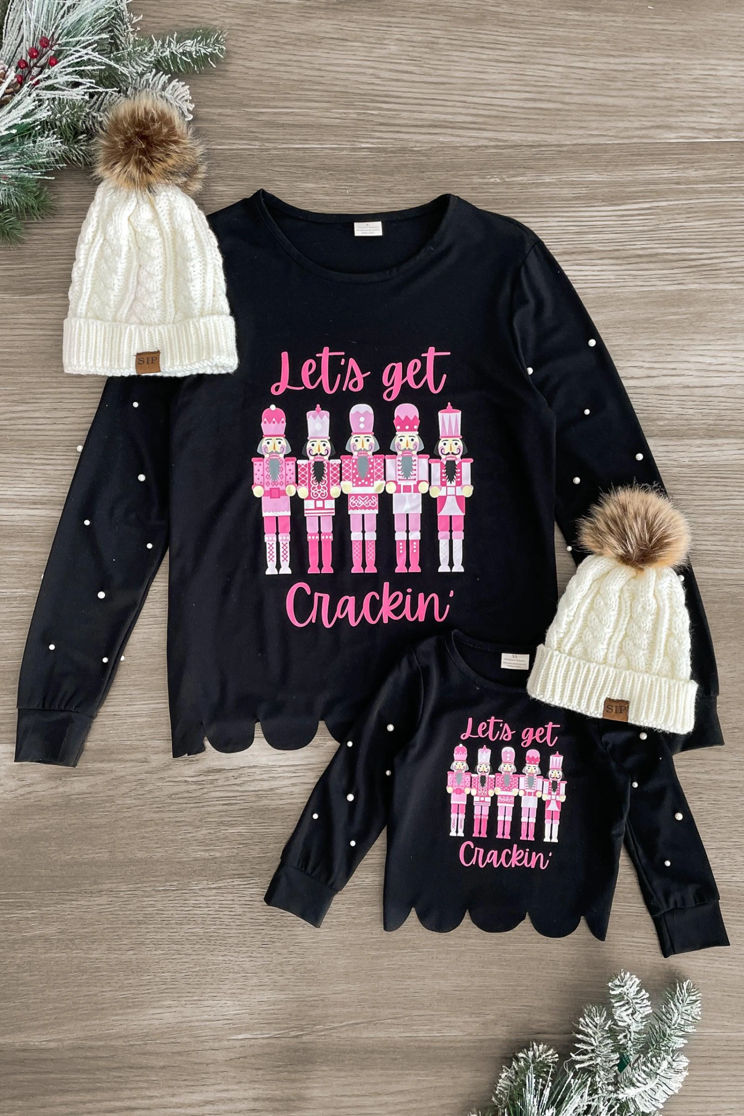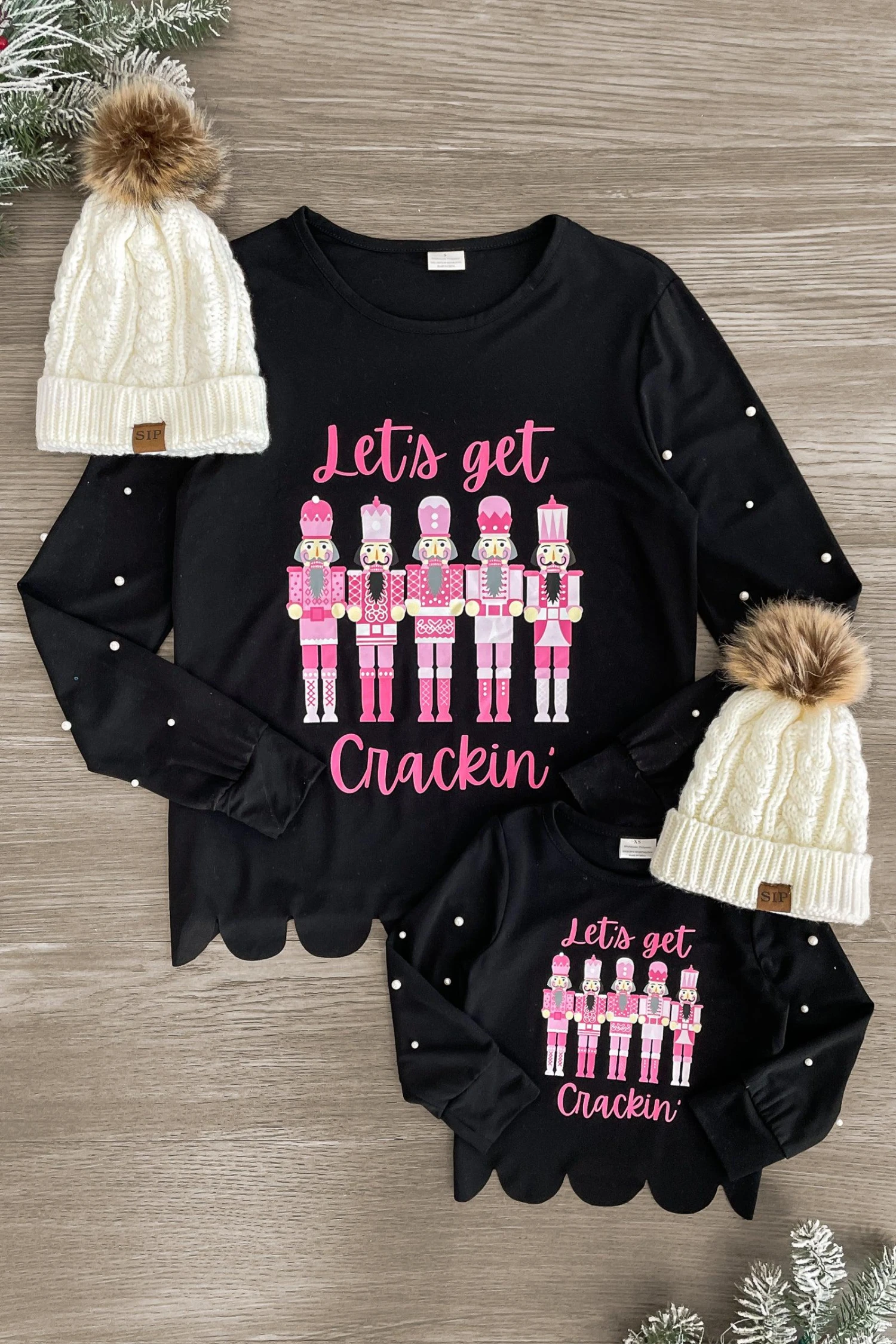 - Both mom & child tops feature a pink nutcracker design on the front