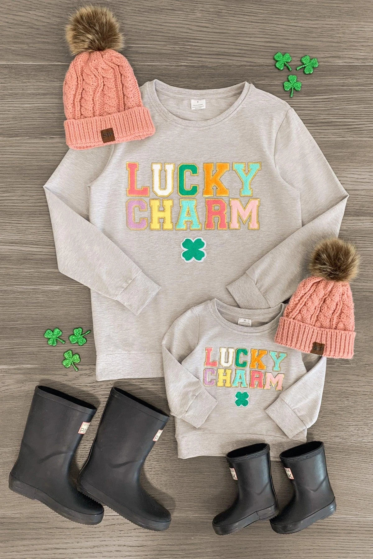 - Mom & child tops both feature a “Lucky Charm” chenille patch on the front
