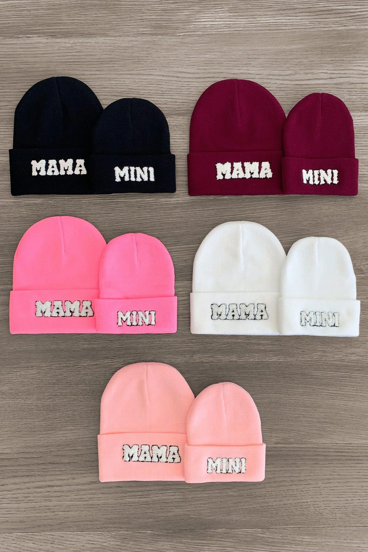 - Mom & child beanies feature an embroidered “Mama” or “Mini” design