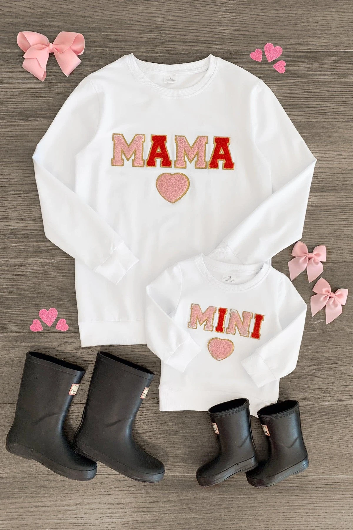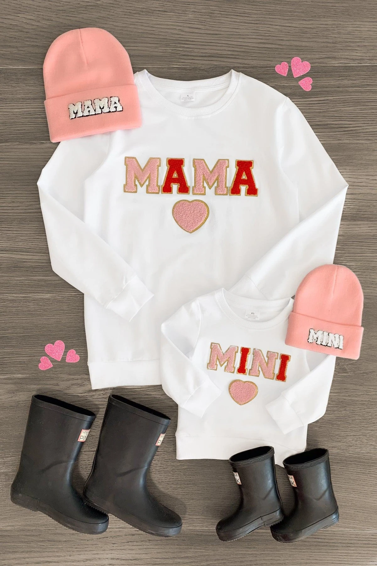 - Mom & child tops both feature a “Mama & Mini” chenille patch on the front