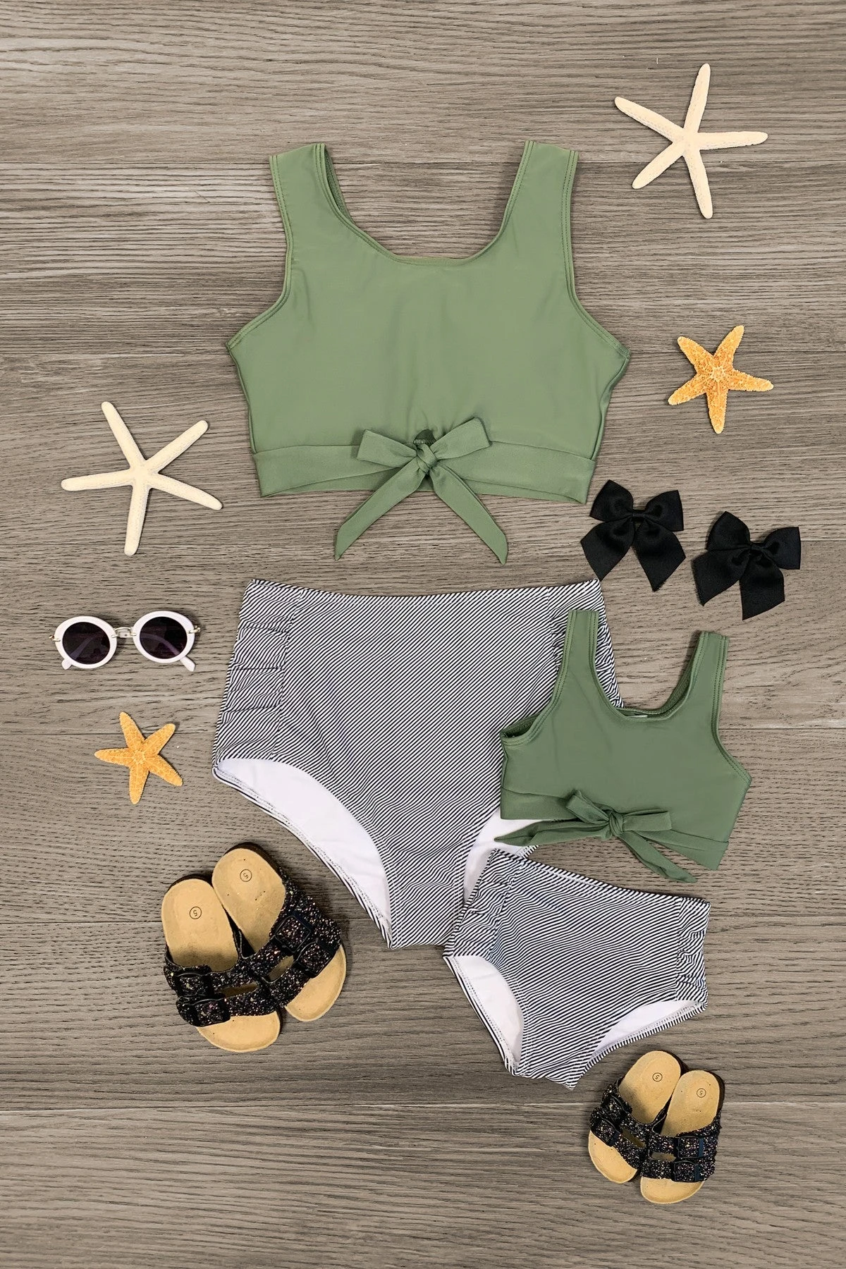 Twinning is winning! You and your little will look adorable on the beach or poolside with friends in our Olive Green Striped Bikini. Made from a soft & lightweight fabric with a flattering design, this two-piece bikini is designed to keep her comfortable both in and out of water. Featuring an olive green & striped design with ruched detailing down the sides, she can pair this swimsuit with our glittery sandals and cute sunnies for a fun, beachy look.