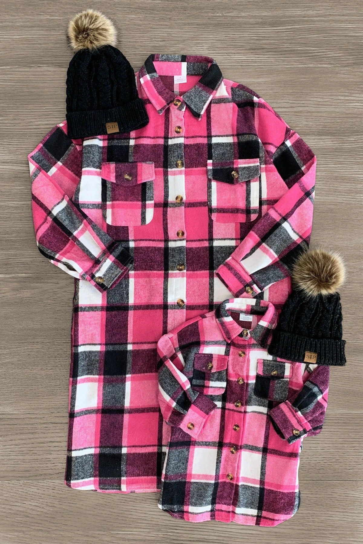 Twinning is winning this season! These Pink Flannel Button Down Shackets feature long sleeves and an allover plaid print. This knee-length shirt jacket is made from a thick, flannel material that will keep her warm & comfy during all adventures. She can pair it with a variety of SIP bottoms & our booties for the perfect look! Little ones love to match their mommy!
