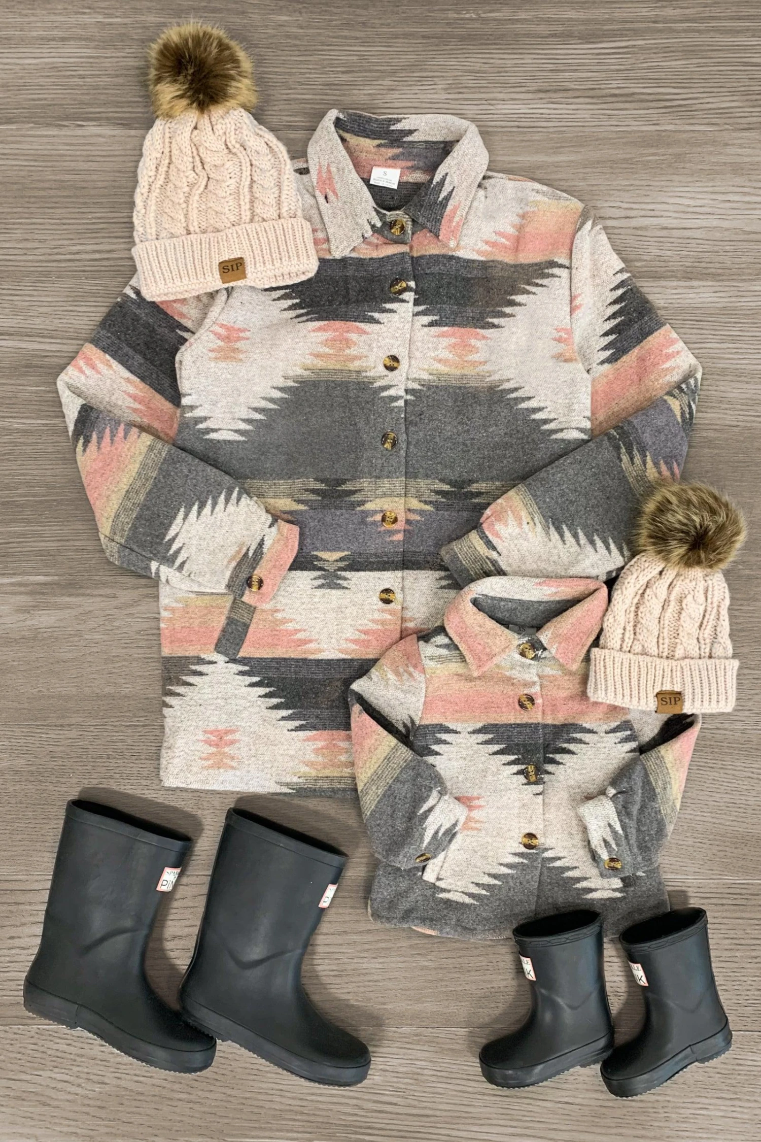 Twinning is winning this season! These Pink & Gray Southwestern Shackets feature long sleeves and an allover gray & pink southwestern pattern. This cozy shirt jacket is made from a thick, flannel-like material that will keep her warm & comfy during all adventures. She can pair it with a variety of SIP bottoms & our booties for the perfect look! Little ones love to match their mommy!