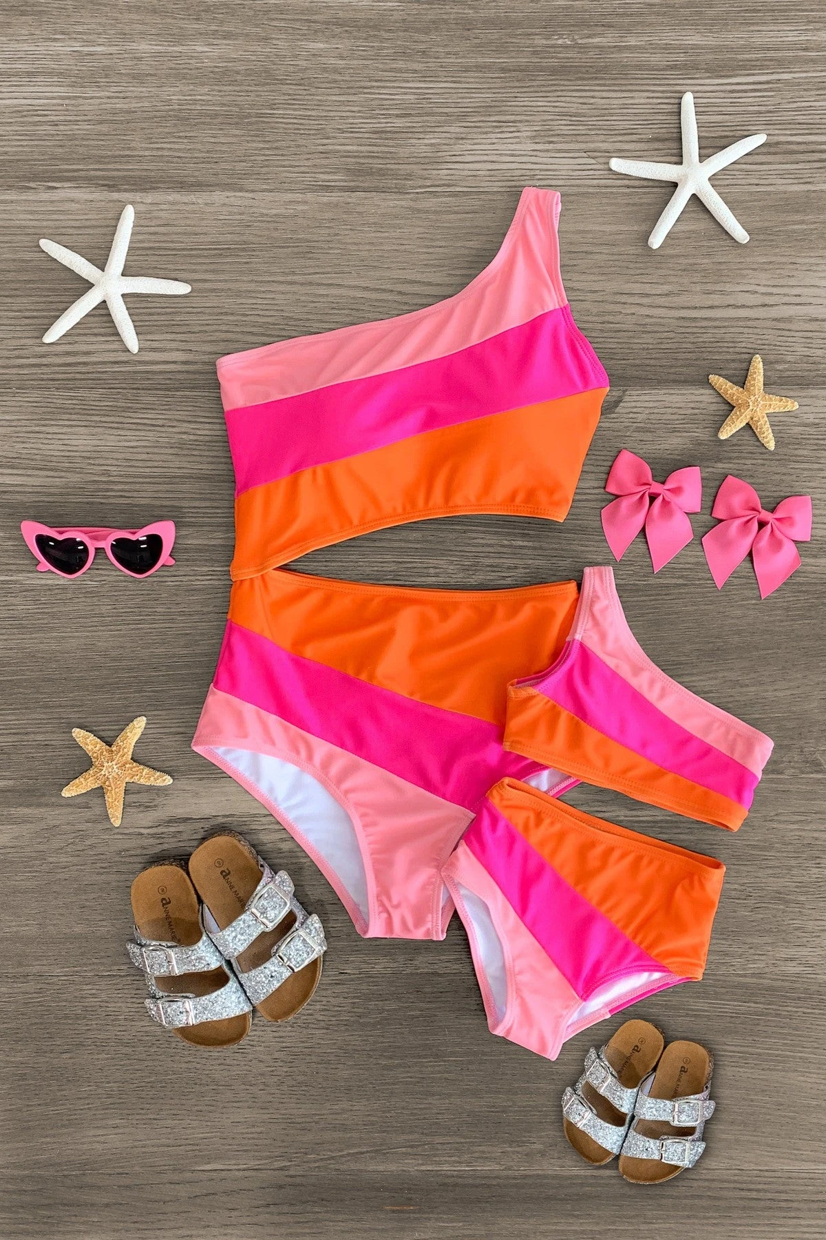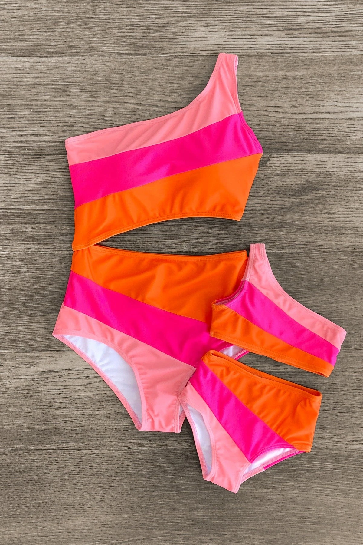 Twinning is winning! You and your little one will look so cute on the beach or poolside in our Pink & Orange Swimsuits. Made from a soft & lightweight fabric, the swimsuit is designed to keep her comfortable both in and out of water. Featuring a pink & orange striped one shoulder design, she can pair this fun swimsuit with sandals and a pair of cute sunnies for the perfect beachy look!