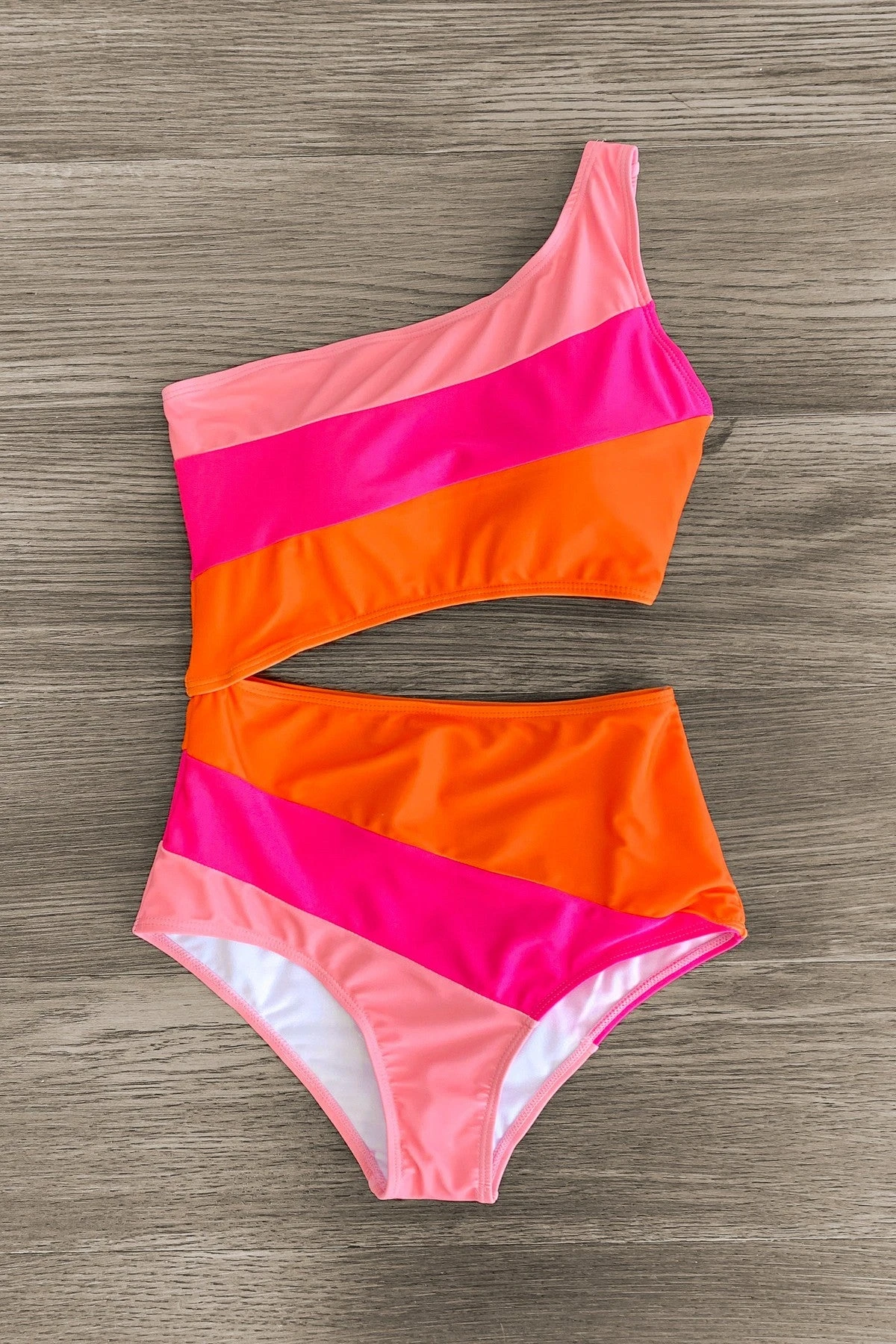 - Pink & orange striped design adds a bright pop to her summer swimwear