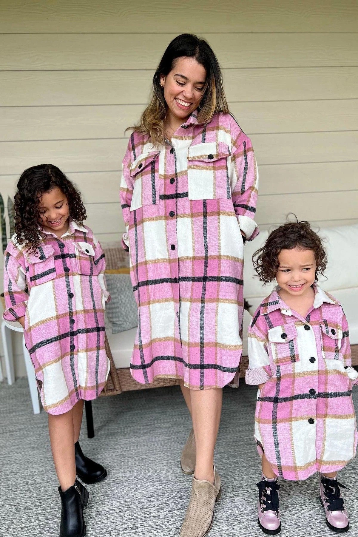 Twinning is winning this season! These Pink Plaid Long Flannel Shackets feature long sleeves and an all-over plaid print. This midi-length shirt jacket is made from a thick, fleece-flannel material that will keep her warm & comfy during all adventures. She can pair it with a variety of SIP bottoms & our booties for the perfect look! Little ones love to match their mommy!