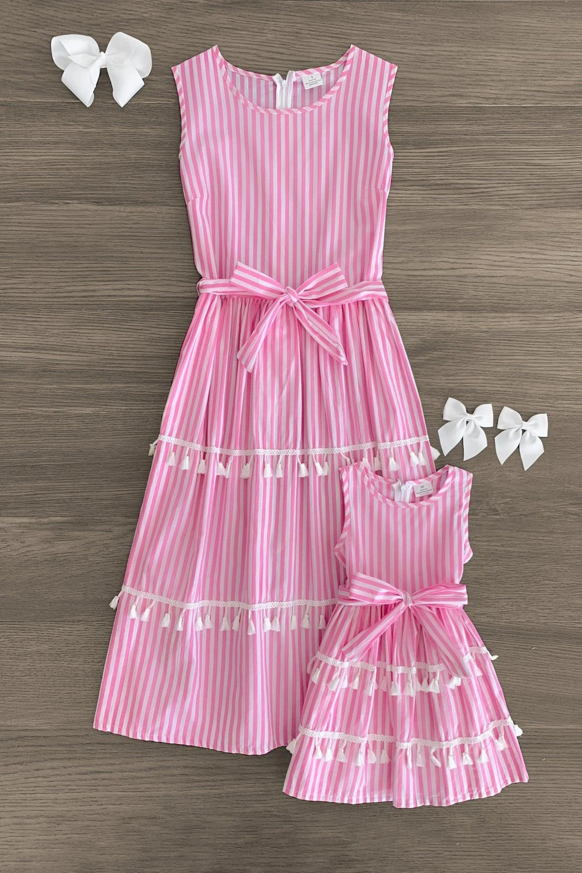 Twinning is winning! You and your little one will look amazing all season in our Pink & White Stripe Tassel Dress. These dresses feature a tie waist with an allover pink striped print with tassel detailing. This dress is made from soft & breathable fabric that will keep her comfy during all adventures. She can pair it with our SIP bows & our sandals for the perfect look! Little ones love to match their mommy!