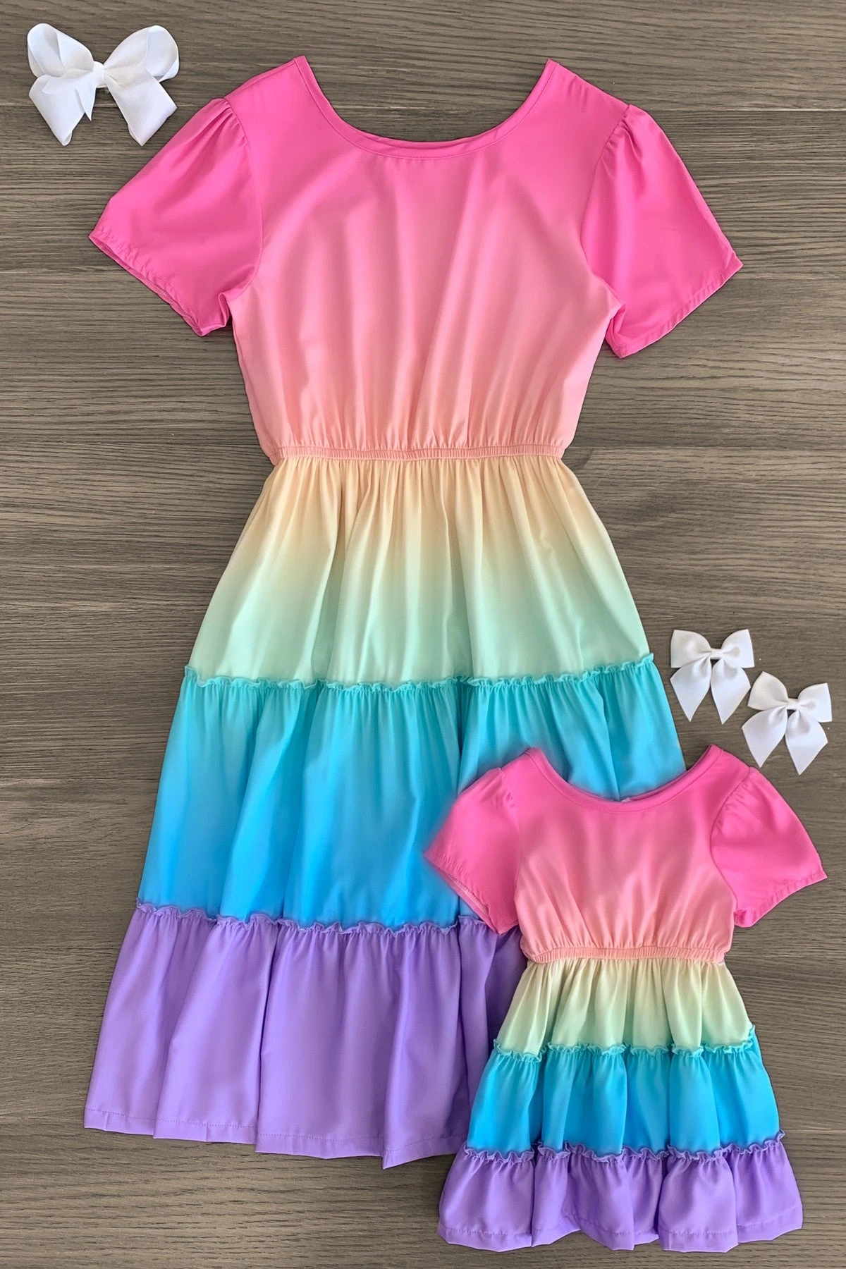 Twinning is winning! You and your little one will look amazing all season in our Rainbow Tiered Dress. These dresses feature short sleeves and an allover ombre rainbow tiered design. The dress is made from soft and breathable fabric that will keep her comfy during all adventures. She can pair it with our SIP bows & our sandals for the perfect look! Little ones love to match their mommy!