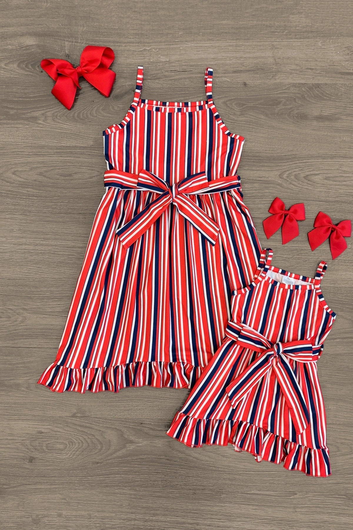 - Mom & child dresses both feature an allover stripes print