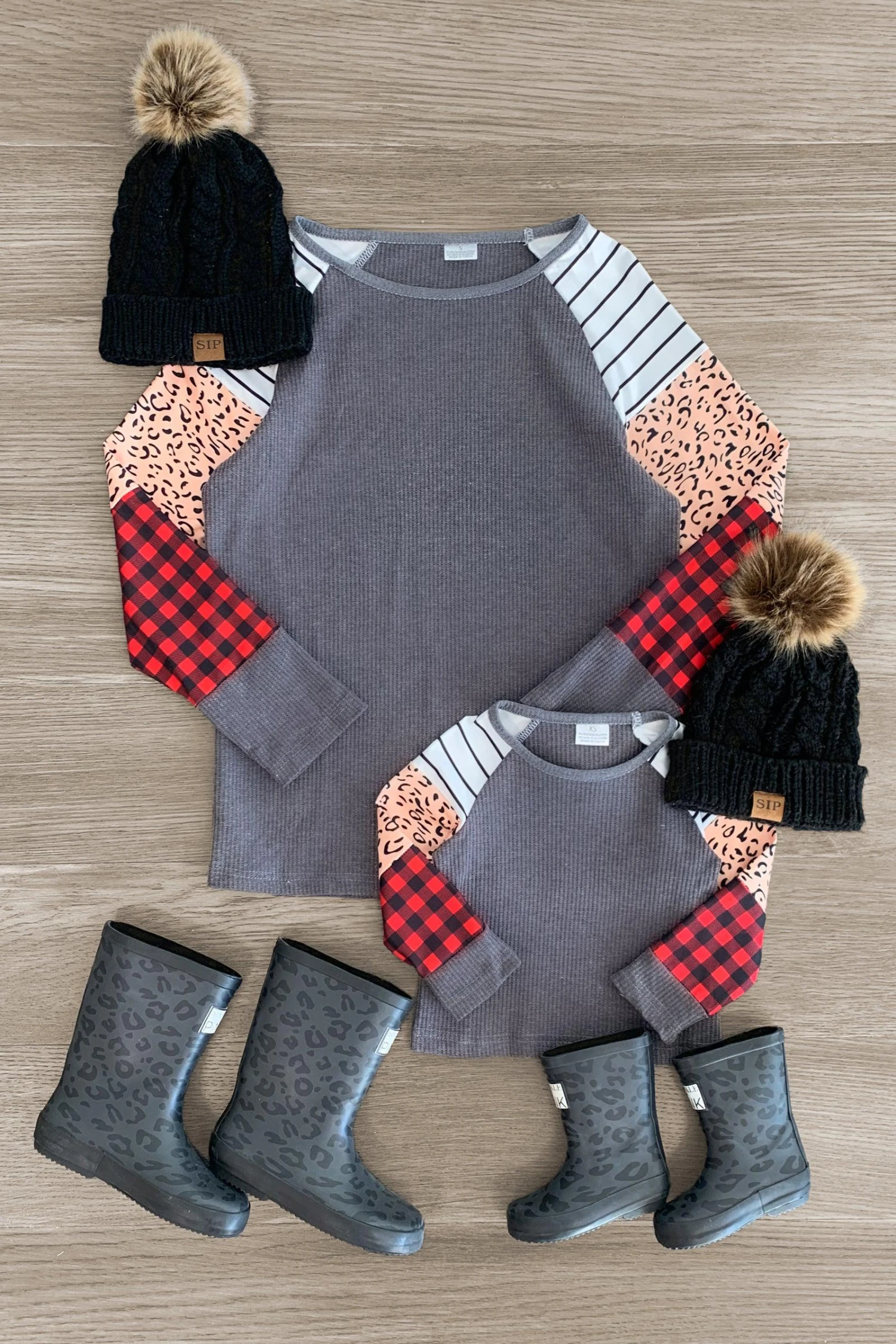 These Striped Leopard Plaid Tops feature a dark gray waffle-knit bodice with leopard, plaid & striped sleeves. This top is made from soft and breathable fabric that will keep her comfy during all adventures. She can pair it with a variety of SIP bottoms & our booties for the perfect look! Little ones love to match their mommy!