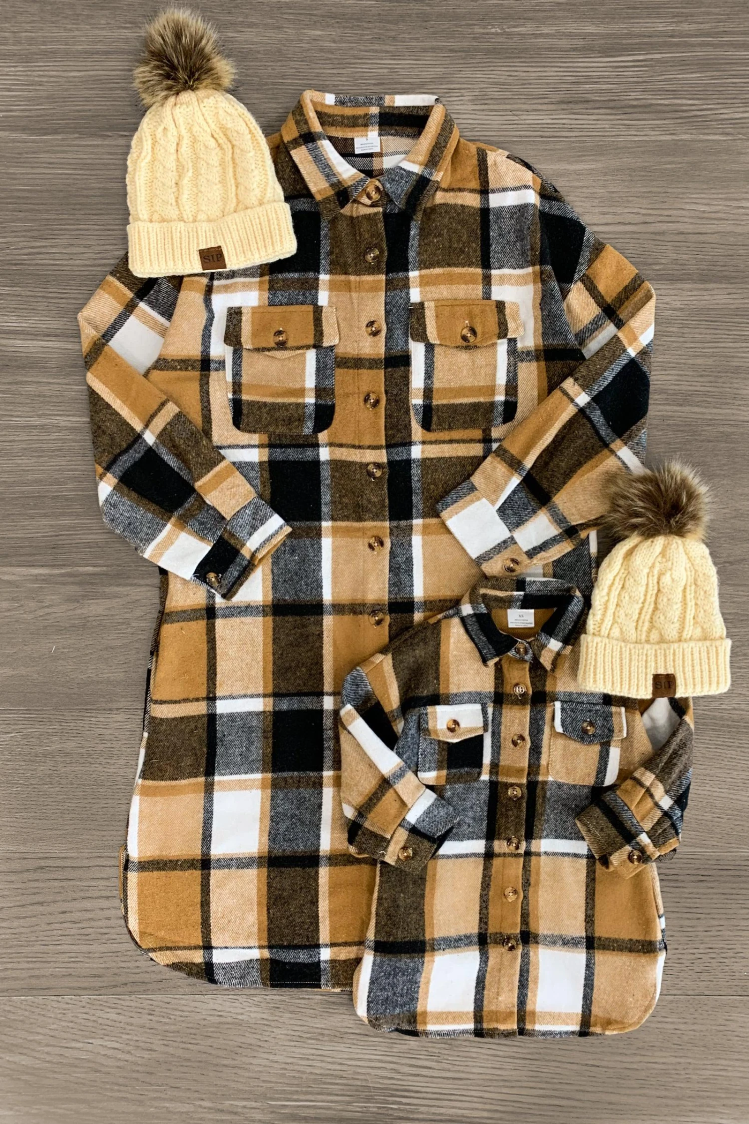 Twinning is winning this season! This Tan Flannel Button Down Shacket feature long sleeves and an allover plaid print. This knee-length shirt jacket is made from a thick, flannel material that will keep her warm & comfy during all adventures. She can pair it with a variety of SIP bottoms & our booties for the perfect look! Little ones love to match their mommy!