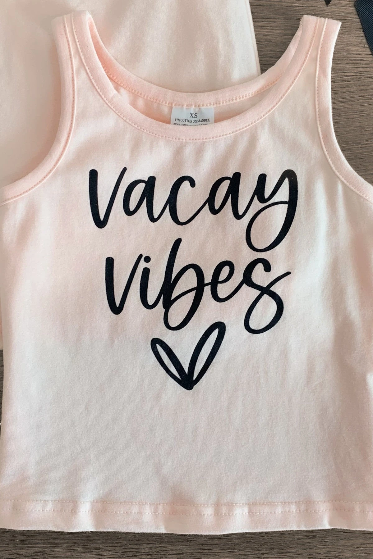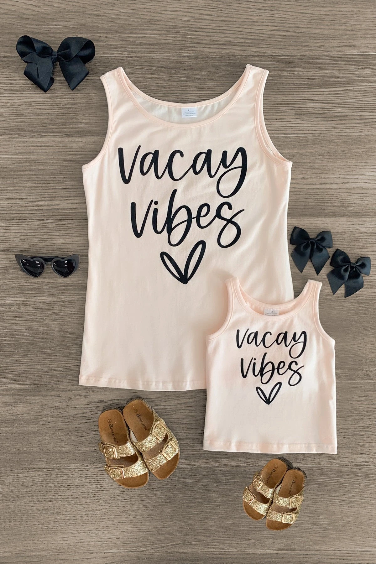- Mom & child tops read “Vacay Vibes” on the front