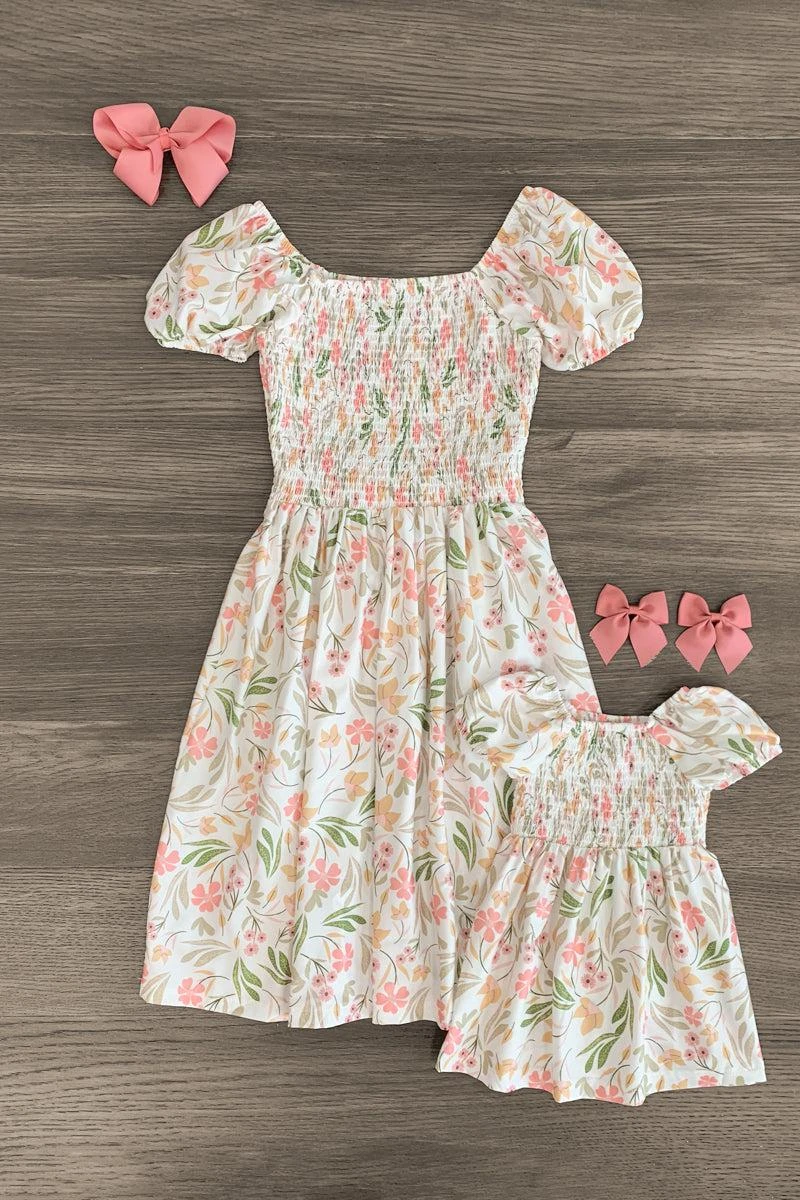 These White Smocked Floral Dresses feature cinch sleeves and an allover floral print. This dress is made from soft and breathable fabric that will keep her comfy during all adventures. The flowy style & smocked bodice offer a feminine fit, while the puff sleves tank sleeves add a fun touch. She can pair it with some SIP bows & our sandals for the perfect look! Little ones love to match their mommy!