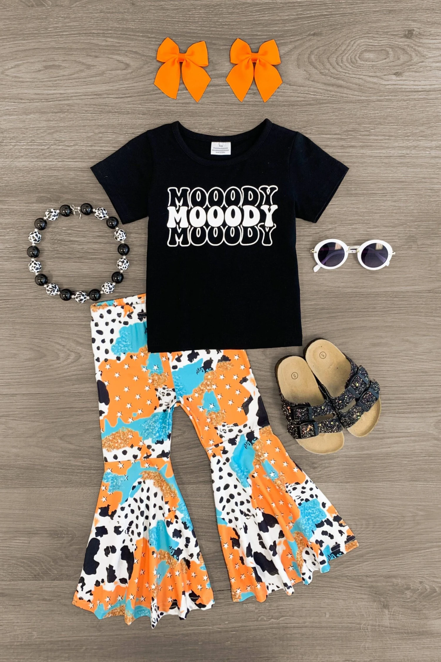 - Girls’ set features a black short sleeve top with “Mooody Mooody Mooody” in a retro style