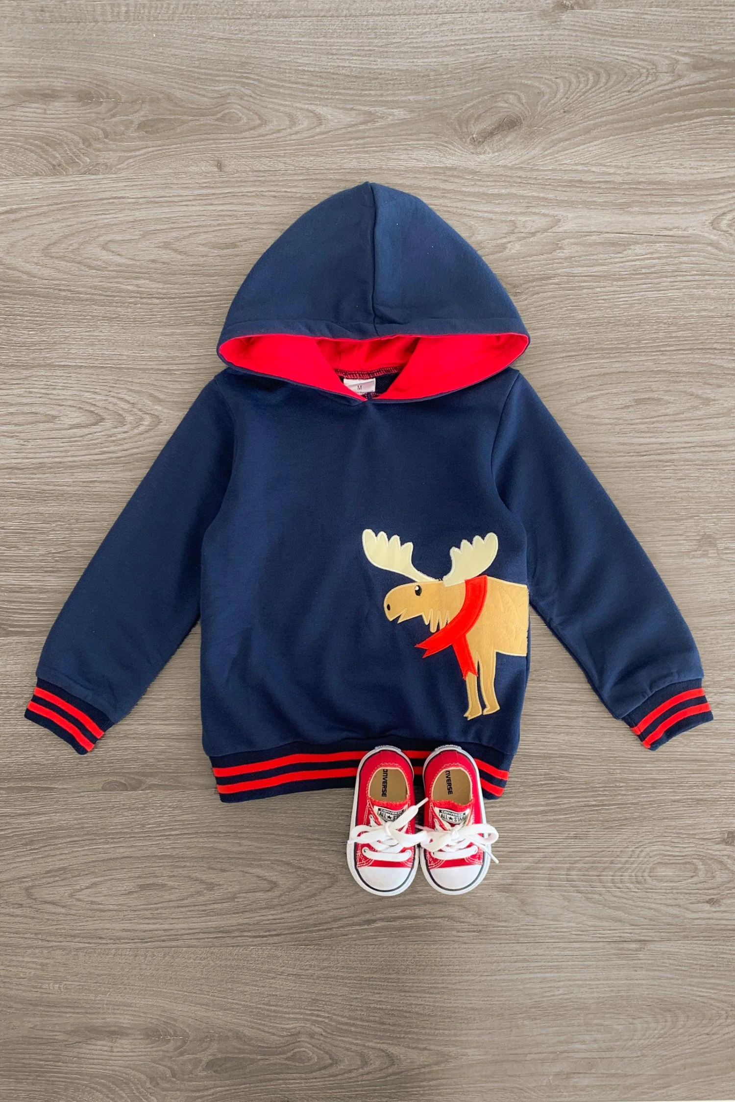 This Navy Blue Moose Hoodie features long sleeves and a cute moose design embroidered on the front. In a fun and festive design, this hooded top is made from soft and cozy fabric that will keep your little one comfy during all adventures. They can pair it with a variety of SIP bottoms or check out our boys’ collection for more hoodies like this one!