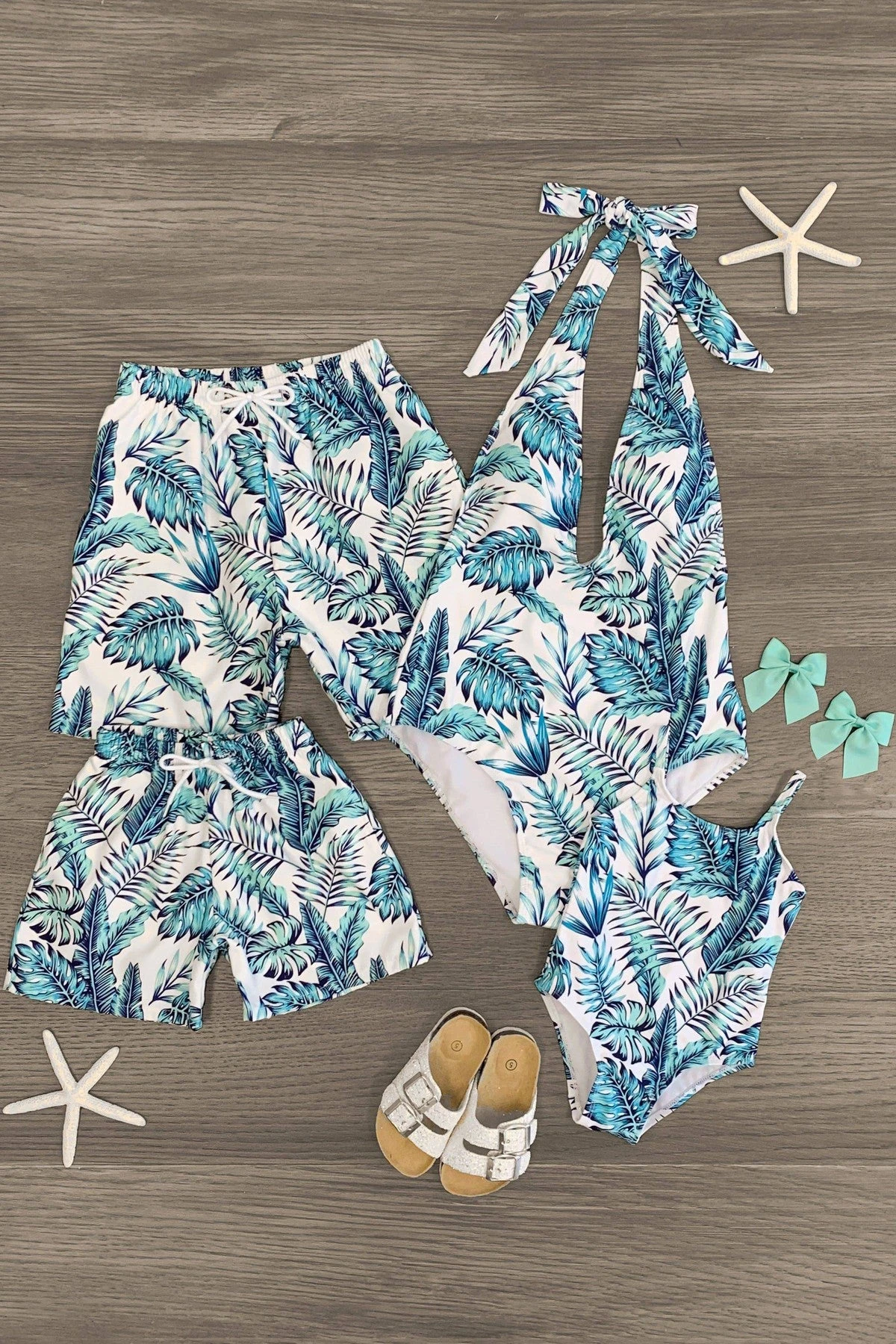 Match with the family in sweet, summery style in these Navy & Mint Palm Family Swimsuits. Mom & girl swimsuits feature a one-piece design with a navy & mint tropical leaf design. Dad & boy swim trunks feature a standard swim trunk design and a matching tropical print. These swimsuits are perfect for your next family beach vacation. Check out our swimsuit collection for more beach & pool-ready looks like this one!