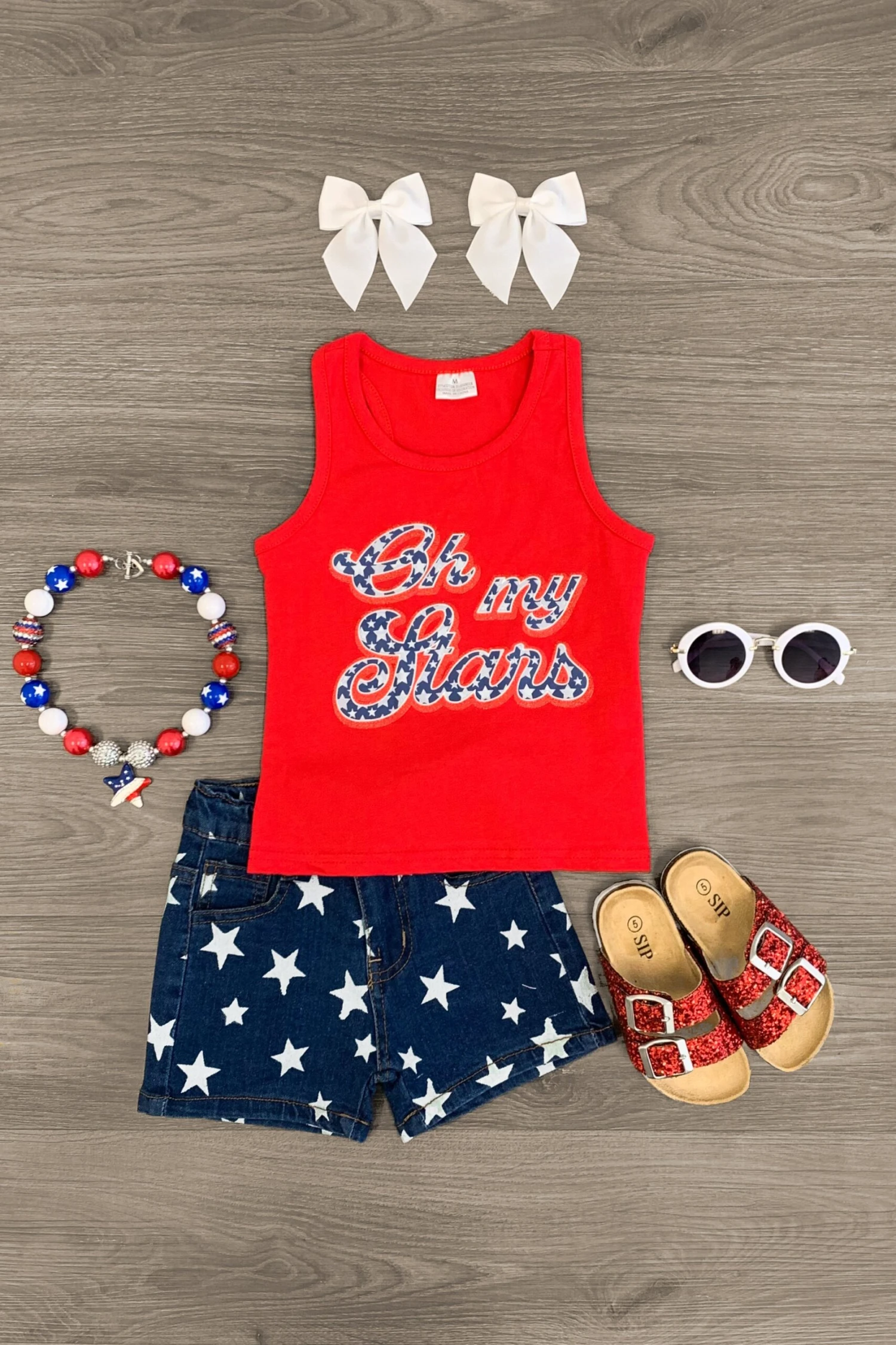 Bring on the warmer weather with this “Oh My Stars” Denim Short Set for girls. This tank top features a solid red design with a cute saying embossed on the front. This top looks adorable paired with the matching denim shorts. The adjustable waistband helps comfort and fit and can be great for on the go, while the star print adds the perfect touch for 4th of July. The top and shorts can be worn as a set and paired with our SIP bows or keep it laid back with a pair of sunglasses, she’ll shine bright in this kids ensemble.