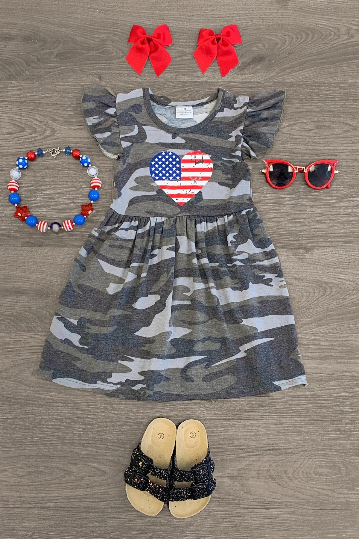From backyard parties to fireworks at the park with family and friends, this Patriotic Heart Camo Dress makes for a perfectly pretty pick for any occasion. Made from a soft and breathable fabric to let her breeze through the day in ease, this dress features an allover camo print for a sweet, feminine look. This dress pairs perfectly with our bows or cute sandals & when the weather gets a little cooler, simply layer on a cardigan and tights for an easy weather transition.