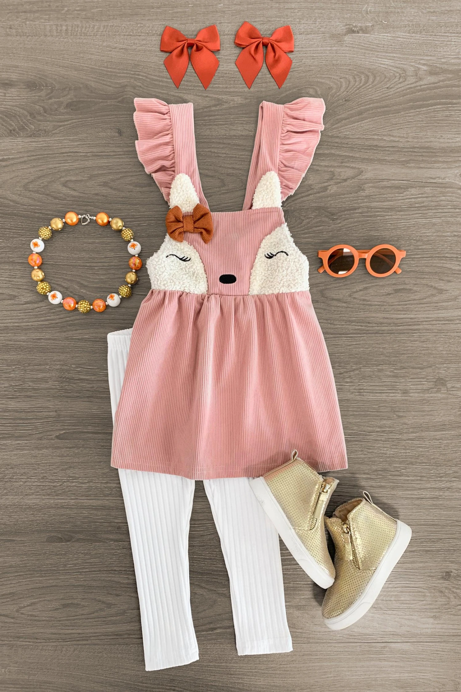 Add sweet & playful style to her look with this Pink Corduroy Fox Jumper Dress Set. This girls’ set is styled with a jumper dress that features a fox face and bow on the bodice that looks adorable paired with the matching white ribbed pants. The breathable fabric makes for comfy wear, while the ruffle shoulder straps allow for simple dressing. She can pair this dress with booties or a matching bow for the perfect look!