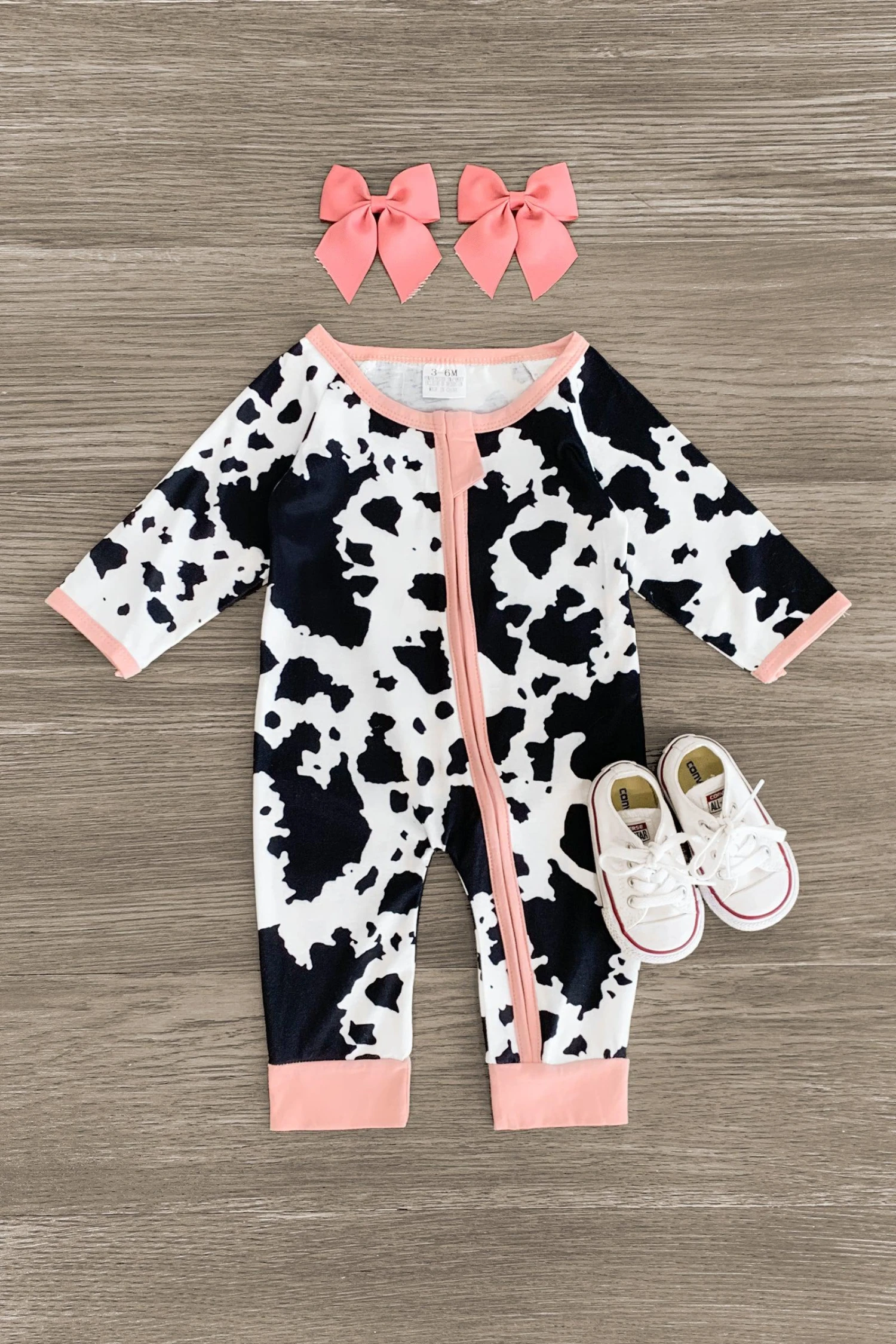 Dress up your little one for cooler days in this Pink Cow Print Romper. This long sleeve romper made from soft & stretchy fabric makes a comfortable one-piece for cool-weather wear. It features an allover cow print pattern. The full-zip design allows for easy dressing and changing. Pair this onesie with a couple of matching bows for the perfect look.