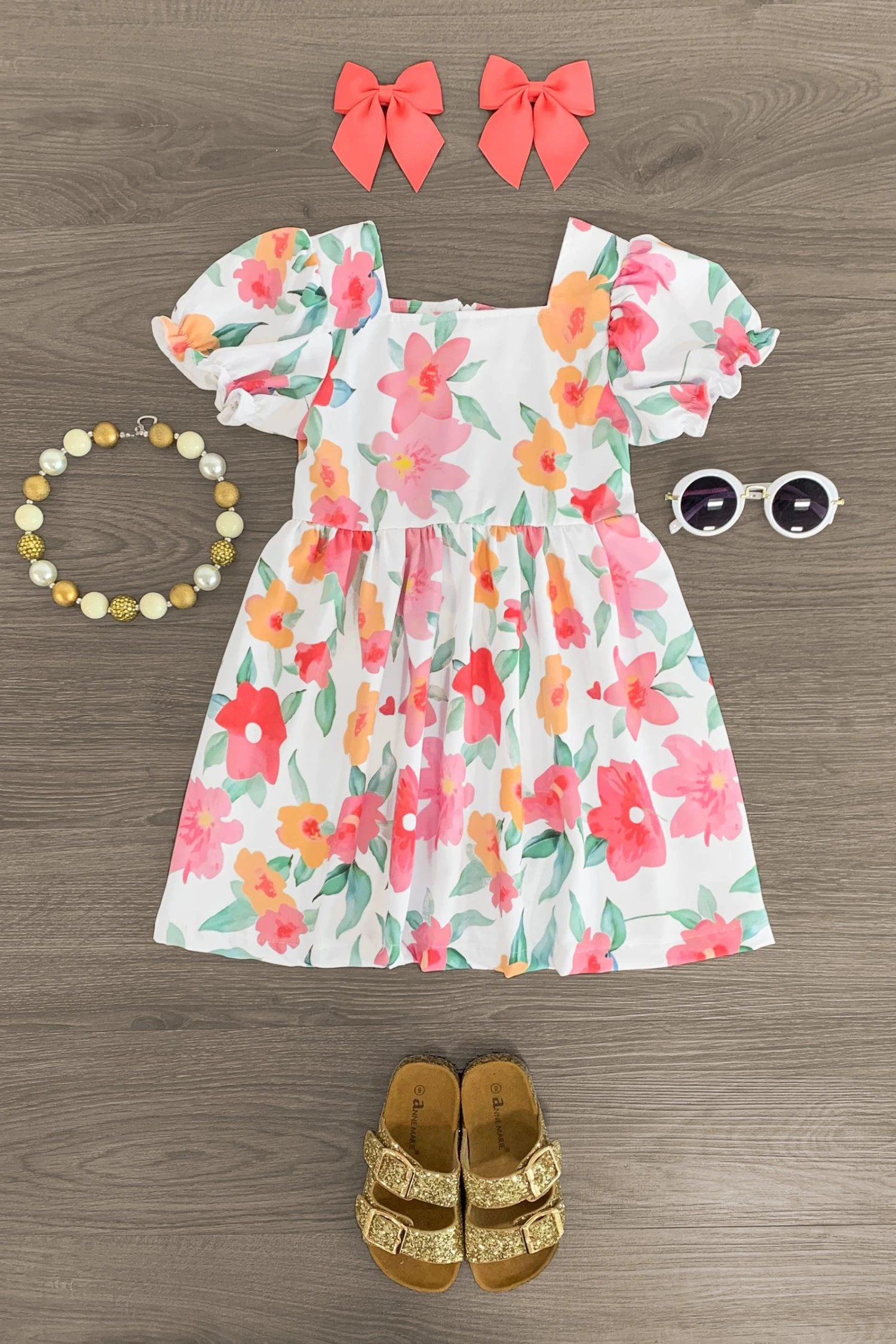 Step out in sweet, fluttery style this season with this Pink Floral Puff Sleeve Dress. This girls’ dress is styled with an adorable white & pink floral pattern. The puff sleeve design makes it a staple addition to her everyday wear, while the zip-up back allows for simple dressing. Pair this whimsical dress with a matching SIP bow or a pair of sandals for the perfect look!