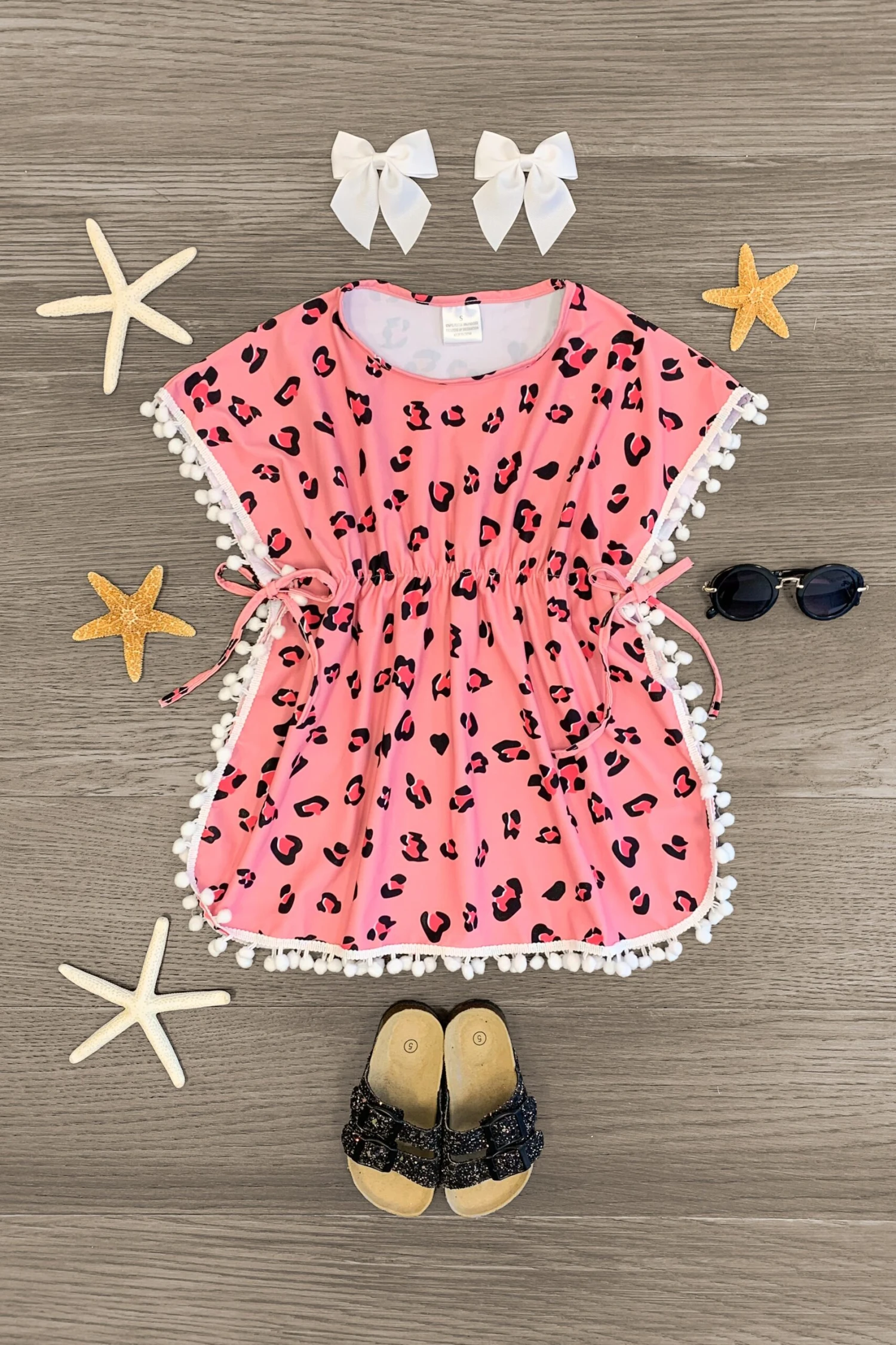 Upgrade her poolside style with this Pink Leopard Poncho Swimsuit Cover Up. Made from a soft and breathable fabric with sweet pom-pom details, this swimsuit cover up will keep her comfy out of the water. She can pair this swimsuit cover with sandals and sunglasses for a fun look whether you’re headed on a fun vacation or just to the backyard with family and friends.