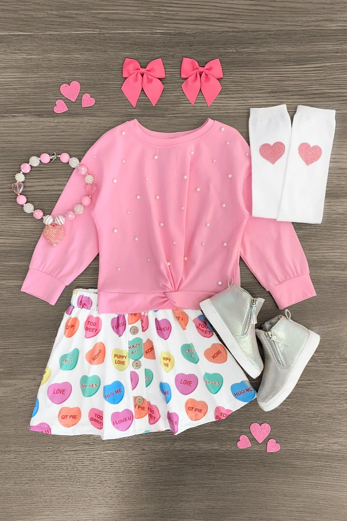 Ouch, our hearts! Your little one will feel the love all day in our Pink Pearl Candy Hearts Skirt Set. The pink long sleeve top features pearl details and looks adorable paired with the matching skirt. The stretchy waistband provides a secure fit and allows for all day comfort, while the candy hearts add a sweet touch. She can pair this set with a pair of booties and our bows for the perfect Valentine’s Day look!