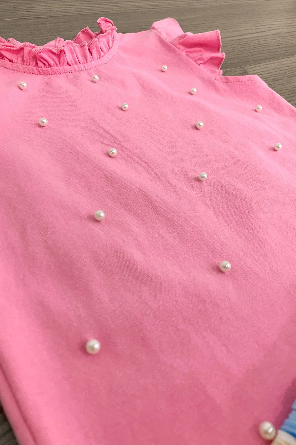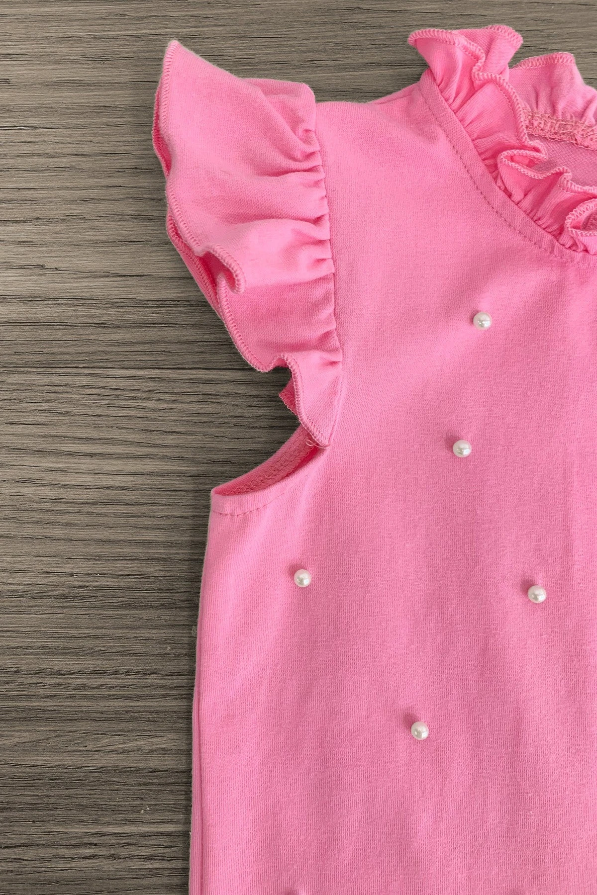 - Girls’ top features an allover pink design with ruffles & pearl detailing