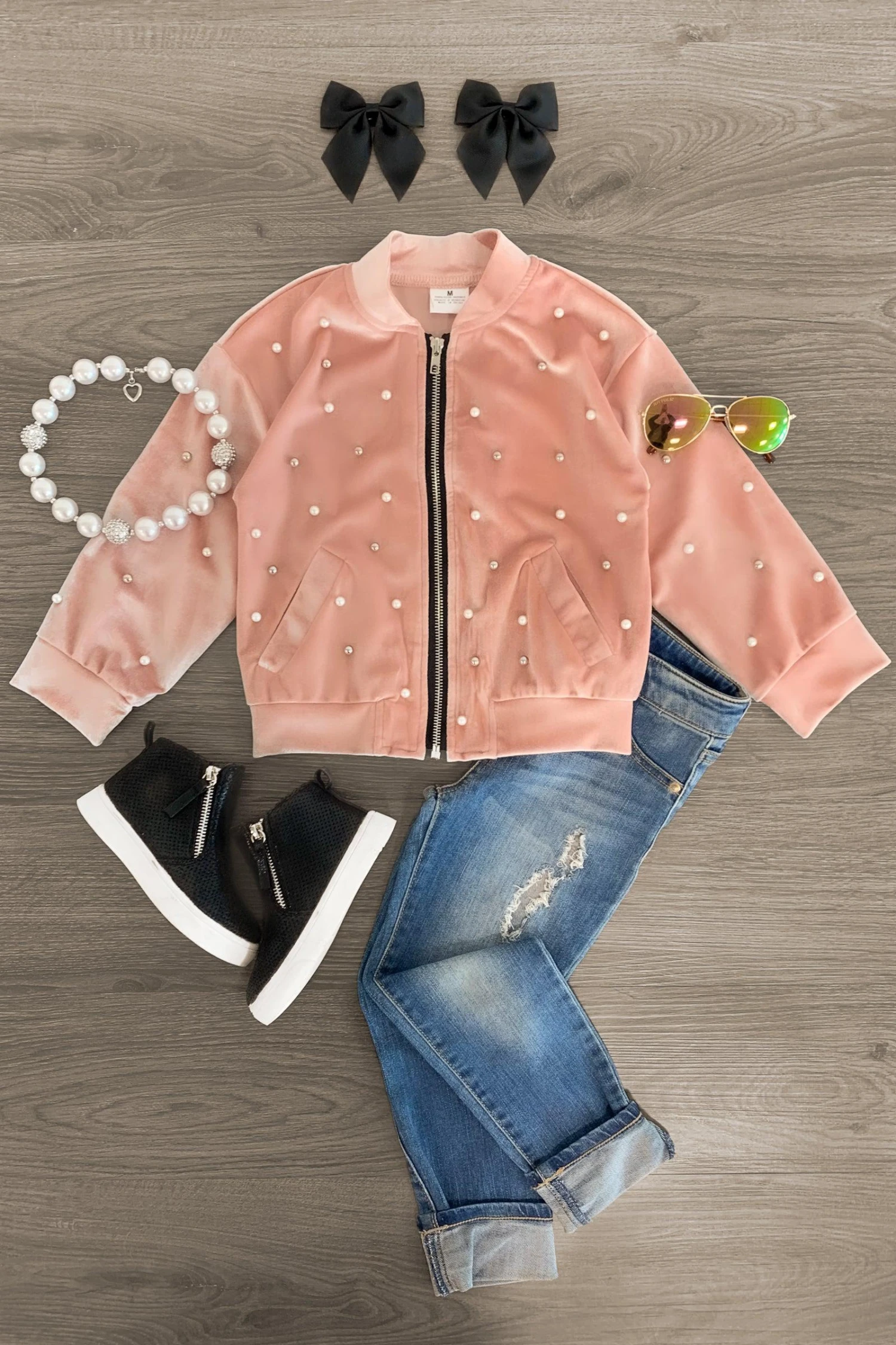Your gal will love the comfort and cool style this Pink Pearl Velvet Jacket brings to her cold weather wardrobe. Made from soft & breathable fabric, this girls’ pink velvet jacket feels soft against her skin, while the pearl detailing adds a fun touch. Pair this jacket with our matching bows or booties for the perfect look!