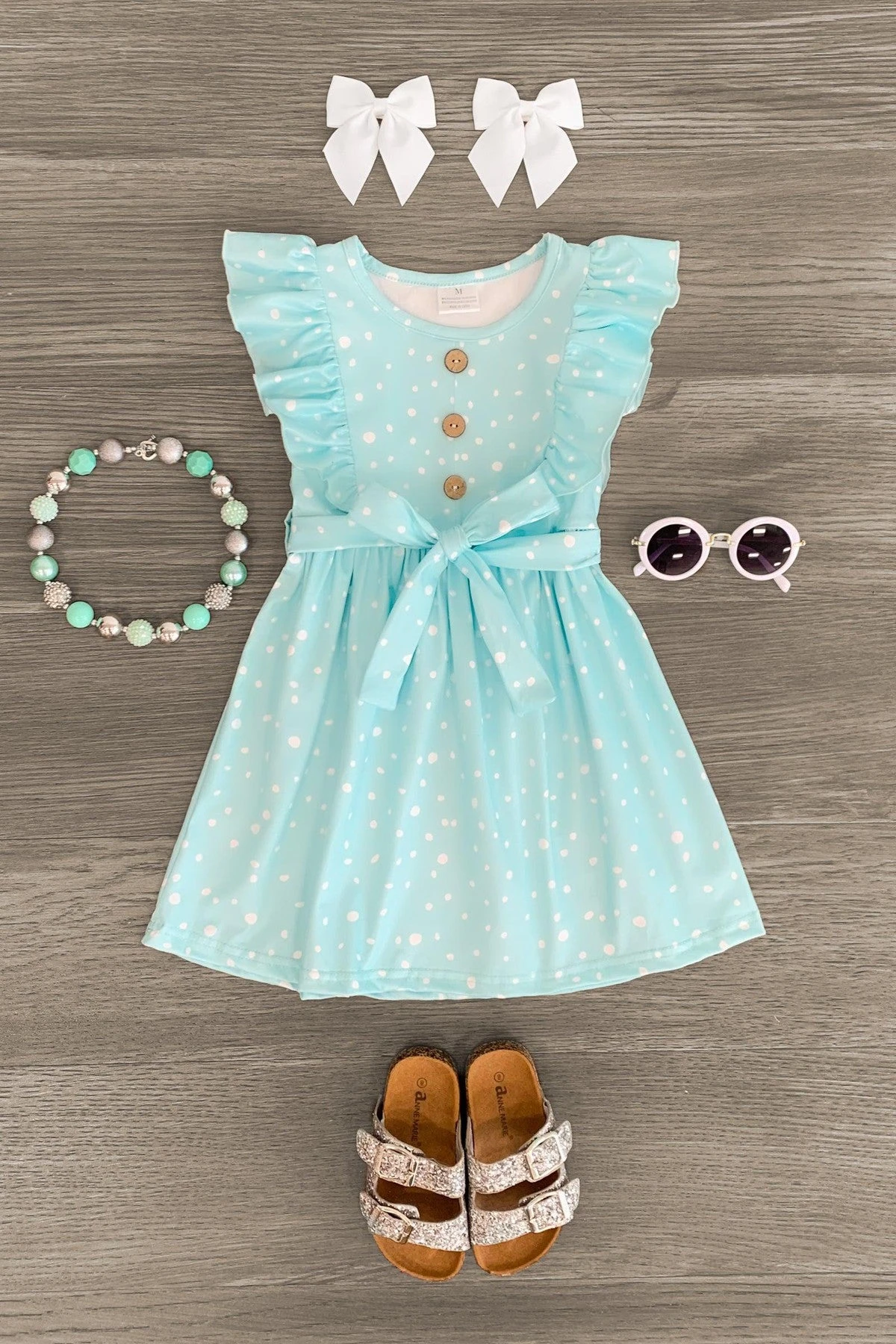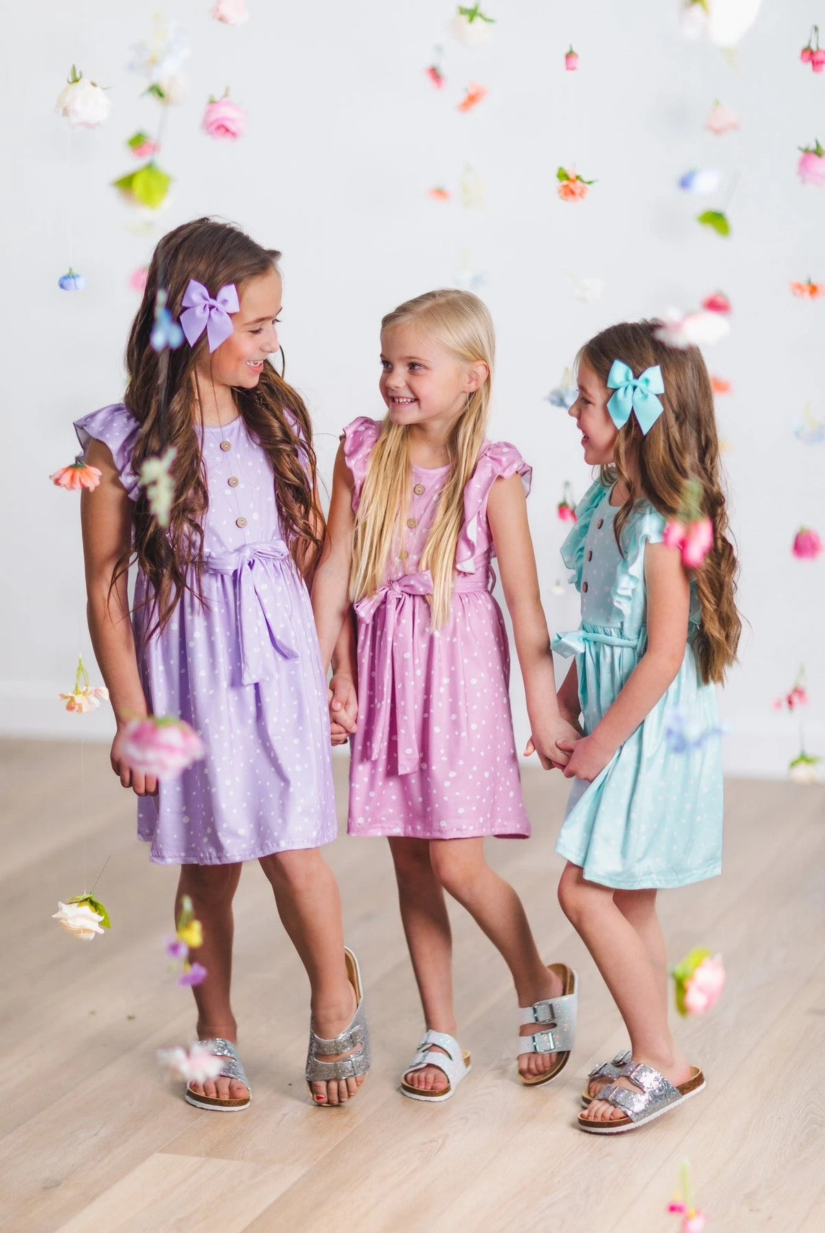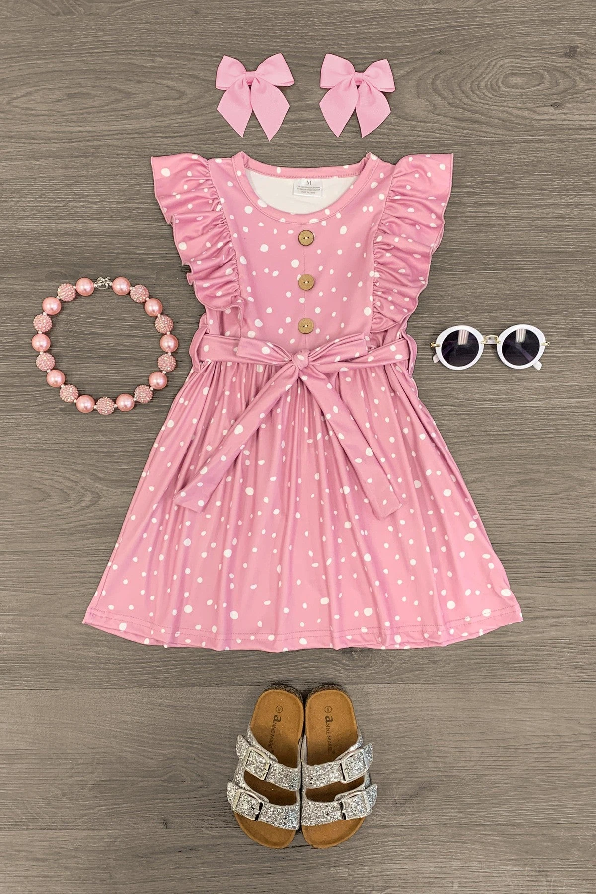 From backyard parties to a picnic in the park with family and friends, this Polka Dot Dress makes for a perfectly pretty pick for any occasion. Made from a soft and breathable fabric to let her breeze through the day in ease, this dress features an allover polka dot print & decorative buttons for a sweet, feminine look. This dress pairs perfectly with our bows or cute sandals & when the weather gets a little cooler, simply layer on a cardigan and tights for an easy weather transition.