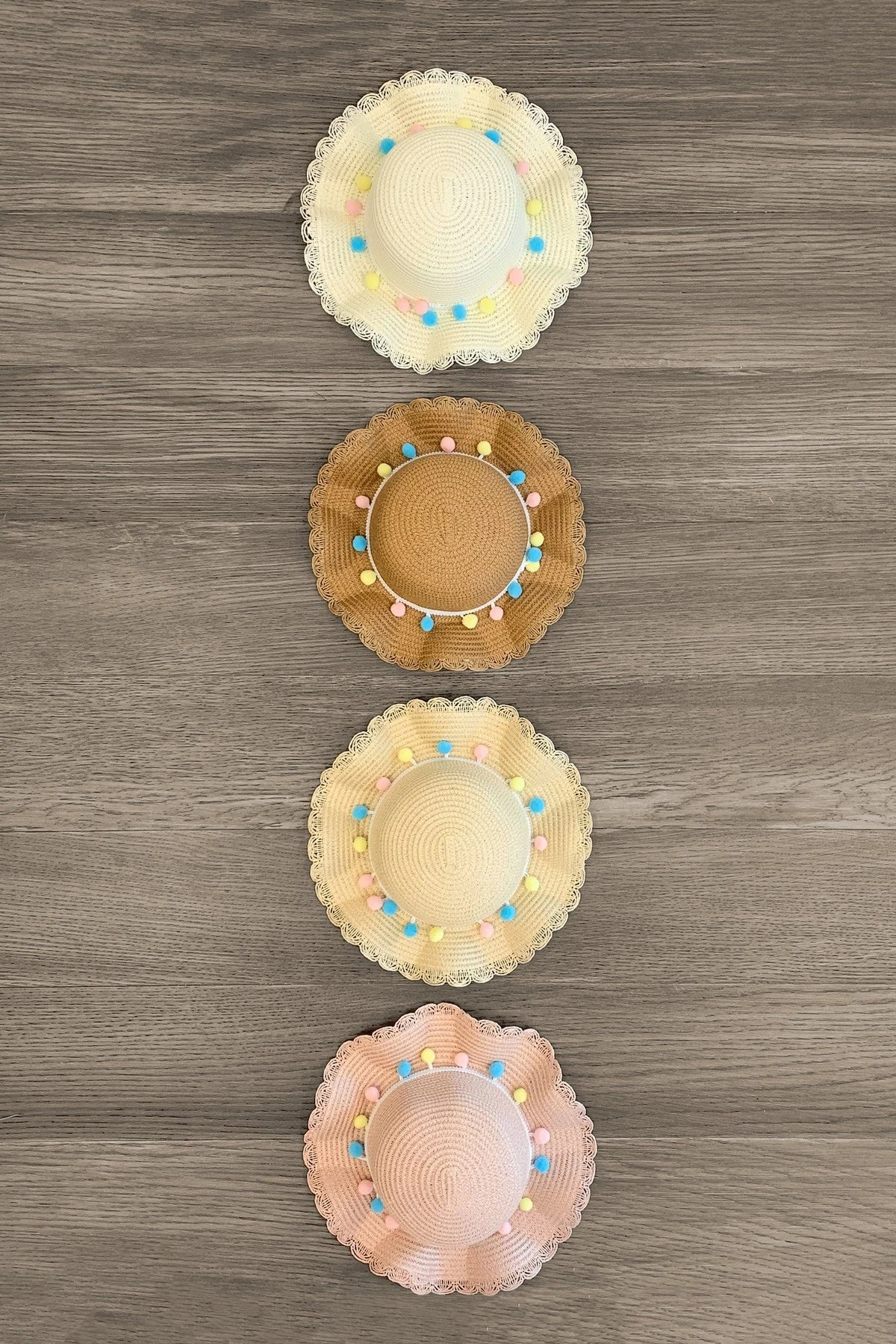 A cute woven hat is just what she needs for those warm, sunny days at the pool and on the beach! This adorable hat is made with a beautiful woven material with pastel pom-pom details to add the perfect touch to all her looks this season. Plus, the chin strap helps keep it secure, and the wide brim helps shade her eyes and face from the sun.