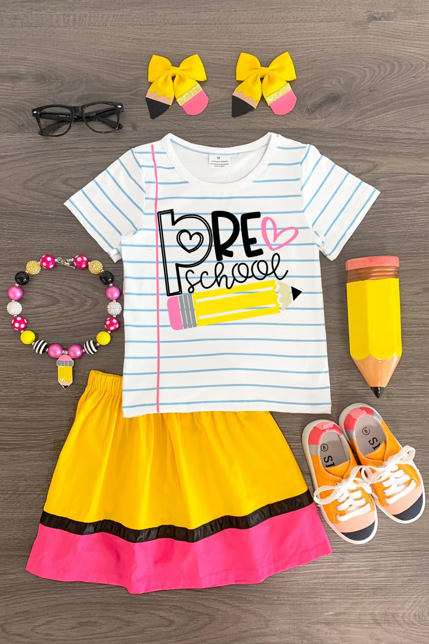 Your sassy little one will look so cute at school in this “Pre-K – 5th Grade” Paper & Pencil Skirt Set for girls. The top features a fun striped grade design and looks adorable paired with the matching skirt. The stretchy waistband helps comfort and fit and can be great for on the go, while the pencil print adds a fun touch to her look. The top and skirt can be worn as a set and paired with our matching bows or keep it laid back with a pair of sandals, she’ll shine bright in this kids ensemble.