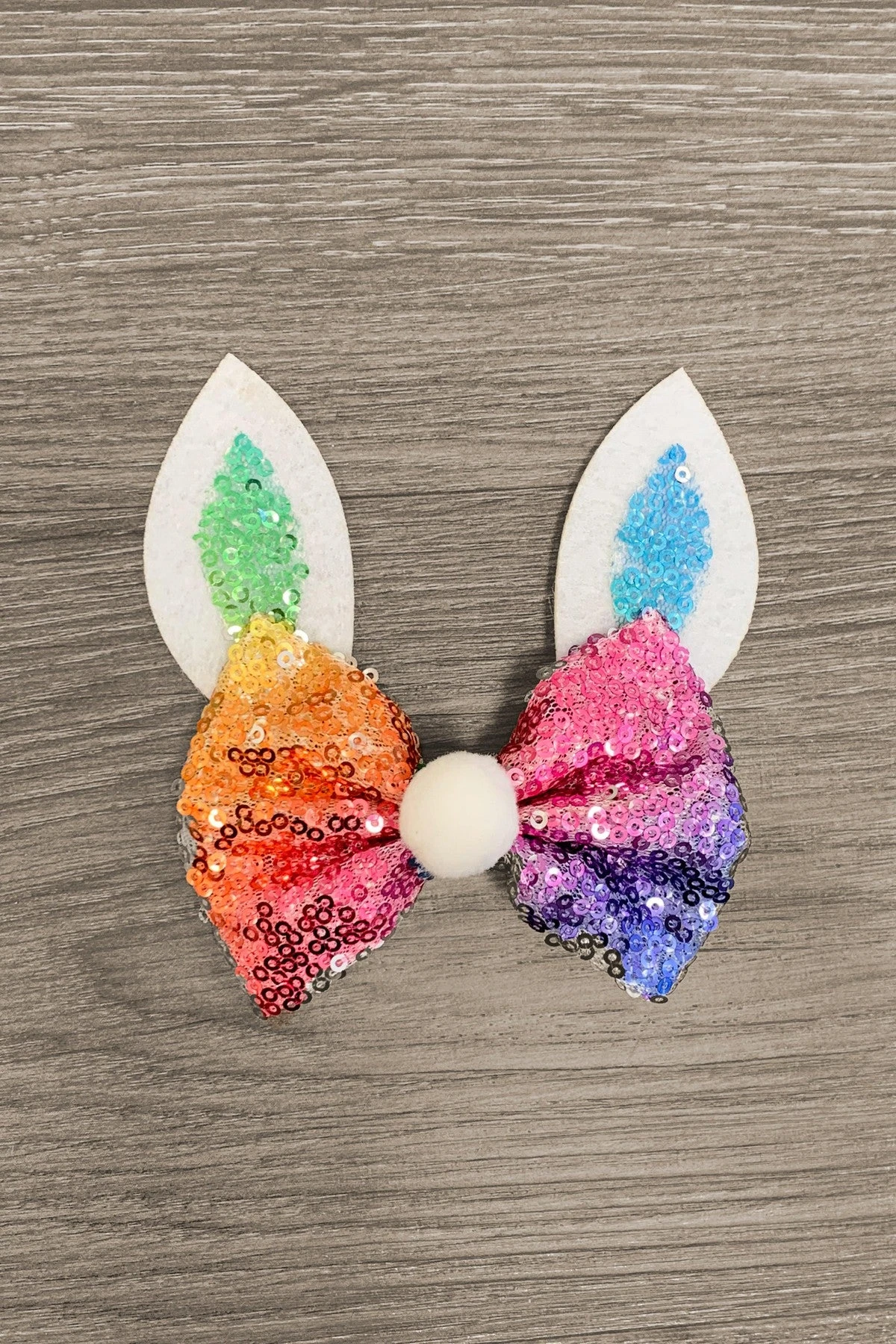 Pep up your little ones wardrobe with this Rainbow Sequin Bunny Bow. Featuring pretty little ears and an allover sequin design that fits her style and adds flair to all her favorite outfits. It’s perfect for short or long hair and adds a fun touch to any hairstyle!