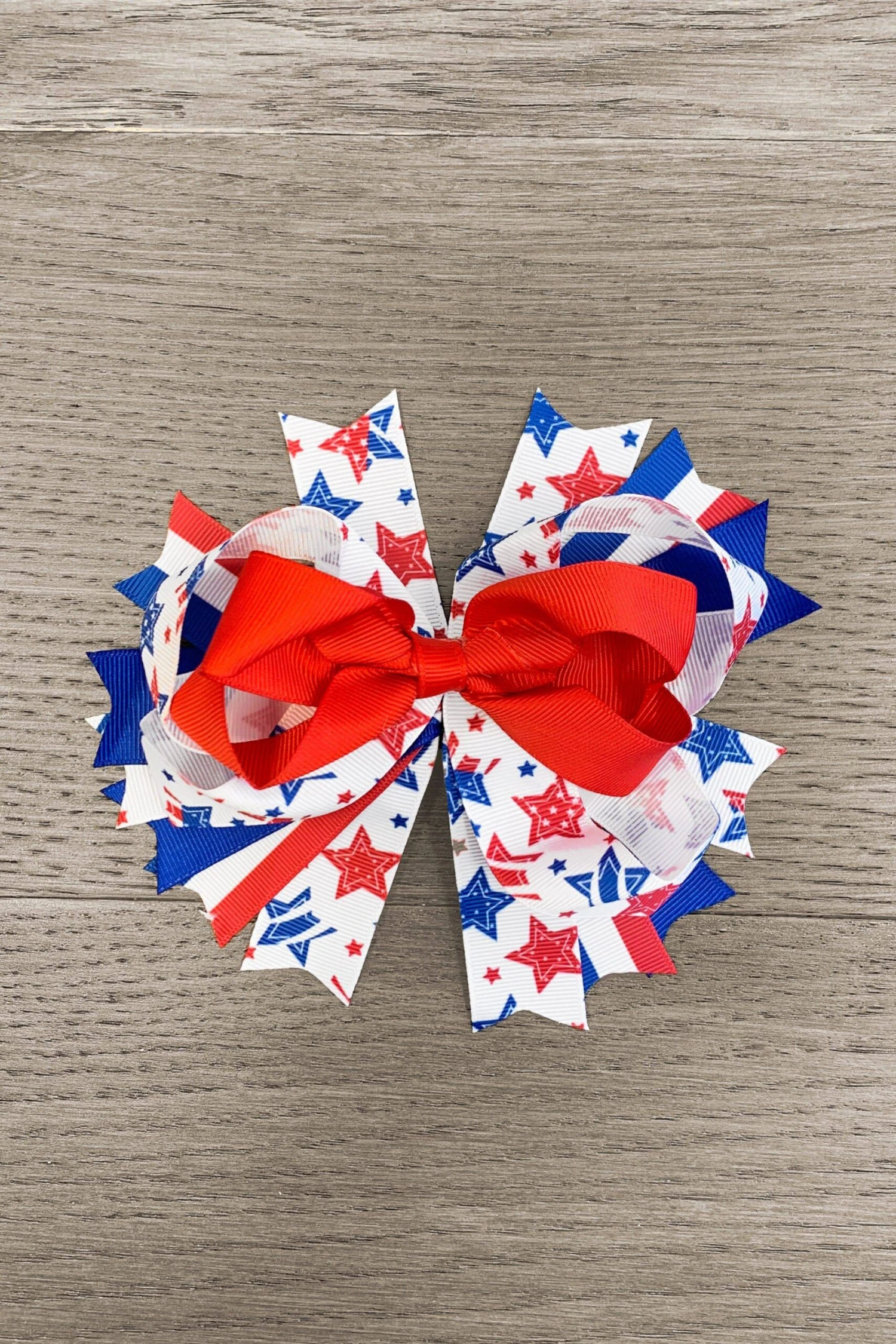 Add cute detail to her everyday hairstyles with this Red & Blue Star Bow. This red, white and blue star print bow makes a versatile piece in her hair accessories, and is easy to match with any patriotic outfit. The girly bow comes attached to an alligator clip that makes it easy to clip into any hairstyle for easy styling. She can wear it with a range of hairstyles, from pigtails to ponytails, for sweet and simple accessorizing.