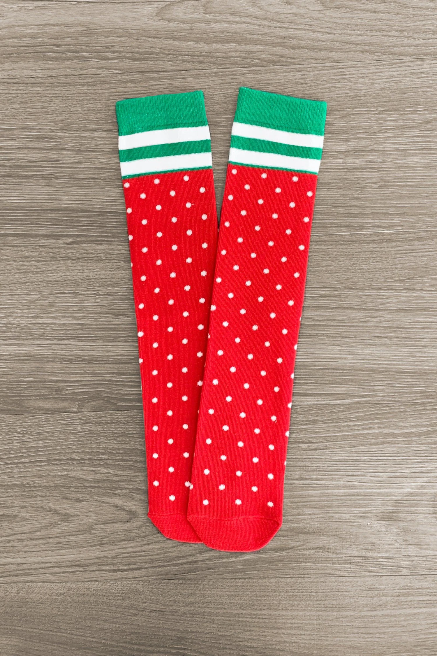 Whether she’s exploring the outdoors with friends or relaxing at home, your girl will be ready for another exciting day in our Red & Green Polka Dot Socks. Made from a durable fabric with added spandex, these girls’ socks provide her feet cozy and stretchy comfort, and they’re designed with banded cuffs that help keep them in place. Pair these socks with our clear rubber boots for the perfect look!