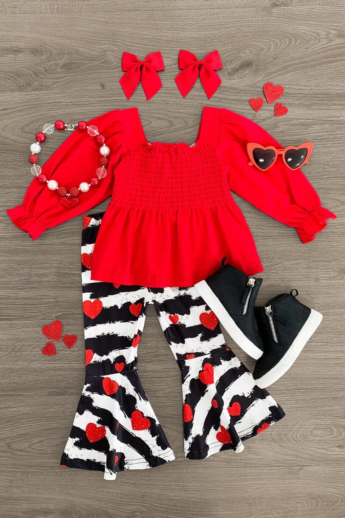 Your little love bug will look so adorable in our Red Heart Striped Bell Bottom Set for girls. The red top features a feminine puff sleeve peplum design that looks adorable paired with the matching bell bottoms. The stretch waistband helps comfort and fit and can be great for on the go, while the striped heart print adds a fun flair. The top and pants can be worn as a set and paired with our SIP booties, or dress it up with a matching necklace, she’ll be ready for the season of love in this ensemble.