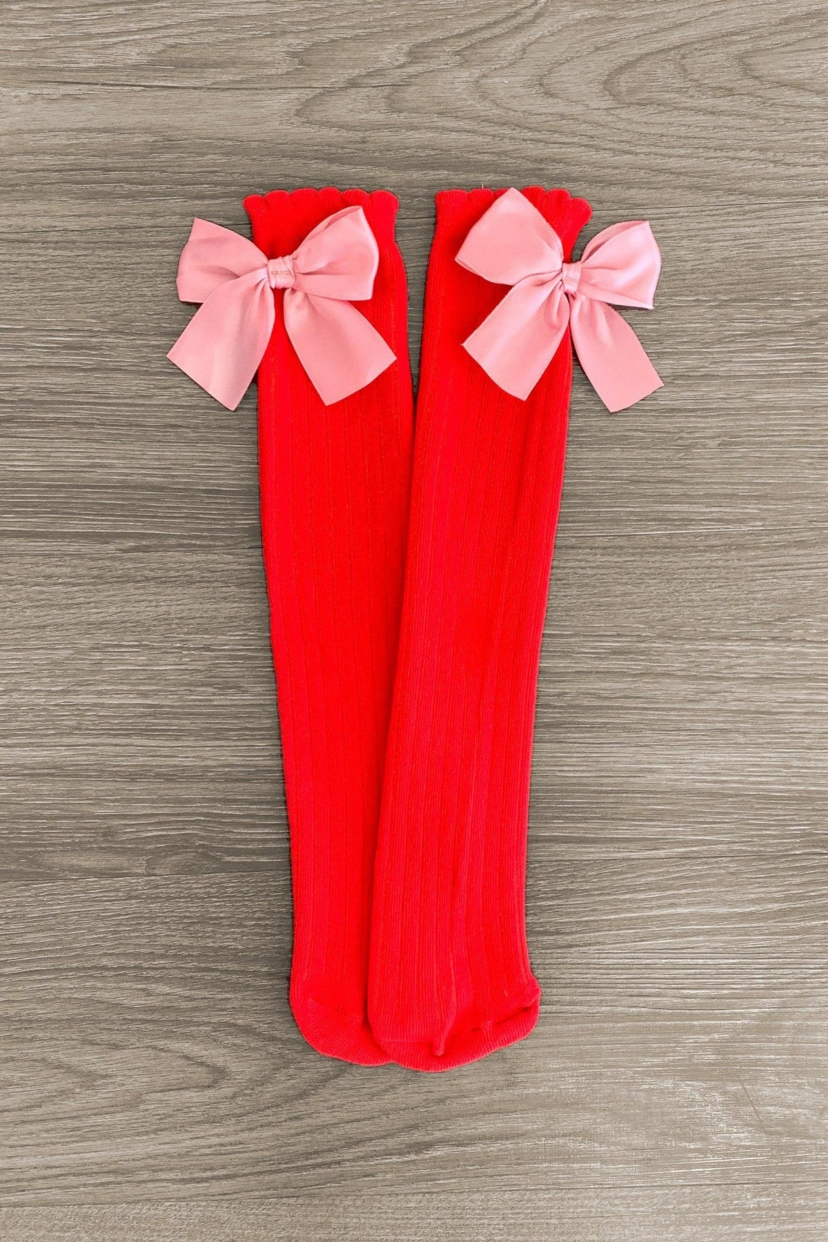 Whether she’s exploring the outdoors with friends or relaxing at home, your girl will be ready for another exciting day in our Red & Pink Bow Socks. Made from a durable fabric with added spandex & bow detailing, these girls’ socks provide her feet cozy and stretchy comfort, and they’re designed with banded cuffs that help keep them in place. Pair these socks with our clear rubber boots for the perfect look!