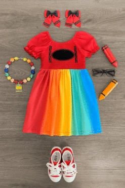 Add sweet style to her look with this Red Rainbow Crayon Dress. This girls’ dress is styled with a simple neckline and short sleeves, making it a staple addition to her classroom wear. The dress features a red bodice with a cute crayon design on the front and a rainbow striped skirt attached. The breathable fabric makes for cool and comfy wear, while the pull-on style allows for simple dressing. She can pair this dress with sandals or a matching bow for the perfect school look!
