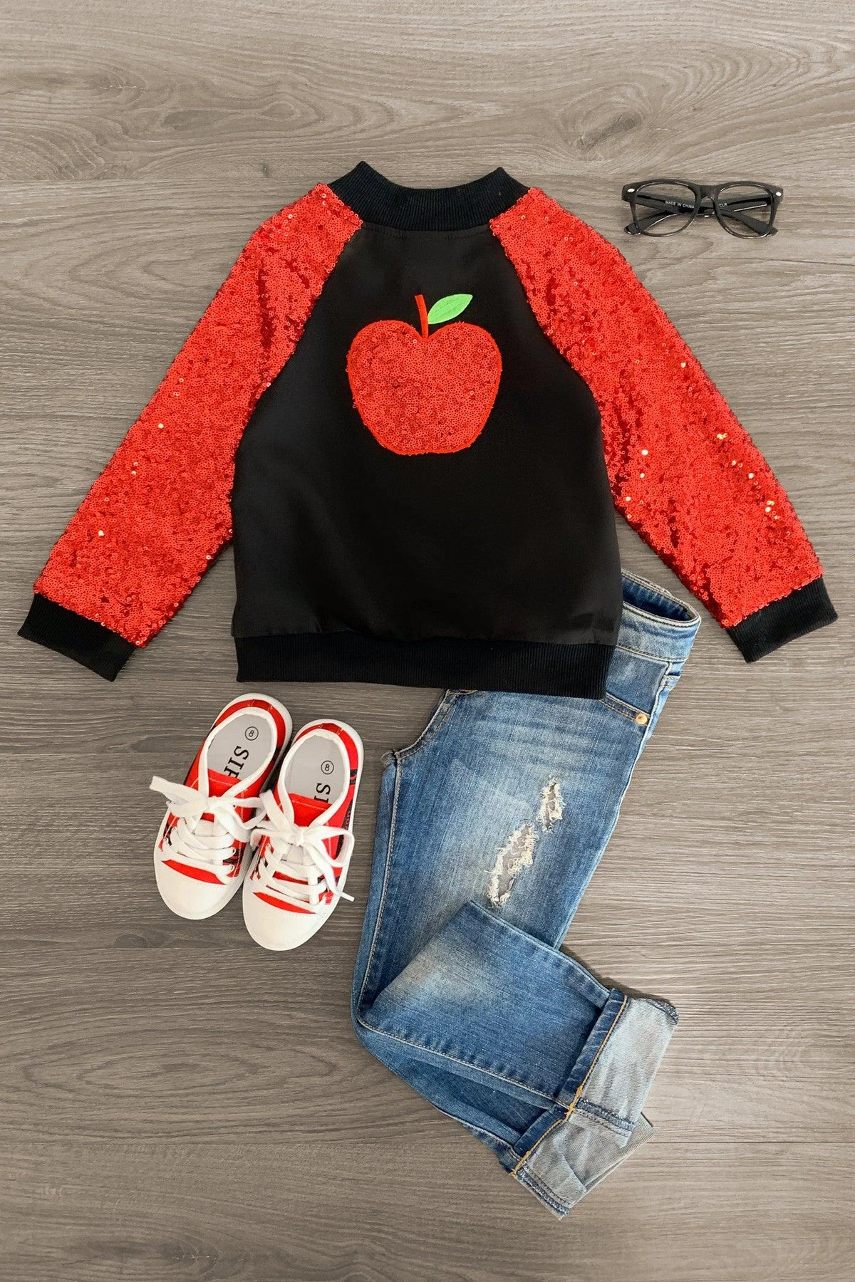Your gal will love the comfort and cool style this Red Sequin Apple Bomber Jacket brings to her wardrobe. Designed in house and exclusive to us, this jacket is perfect for back to school. Made from soft and breathable fabric, this girls’ jacket feels soft against her skin, while the long sleeves offer her a cozy fit. The jacket features an allover black design with red sequin sleeves and fun sequin apple appliqués to match. Pair this jacket with our matching bows or booties for the perfect look!