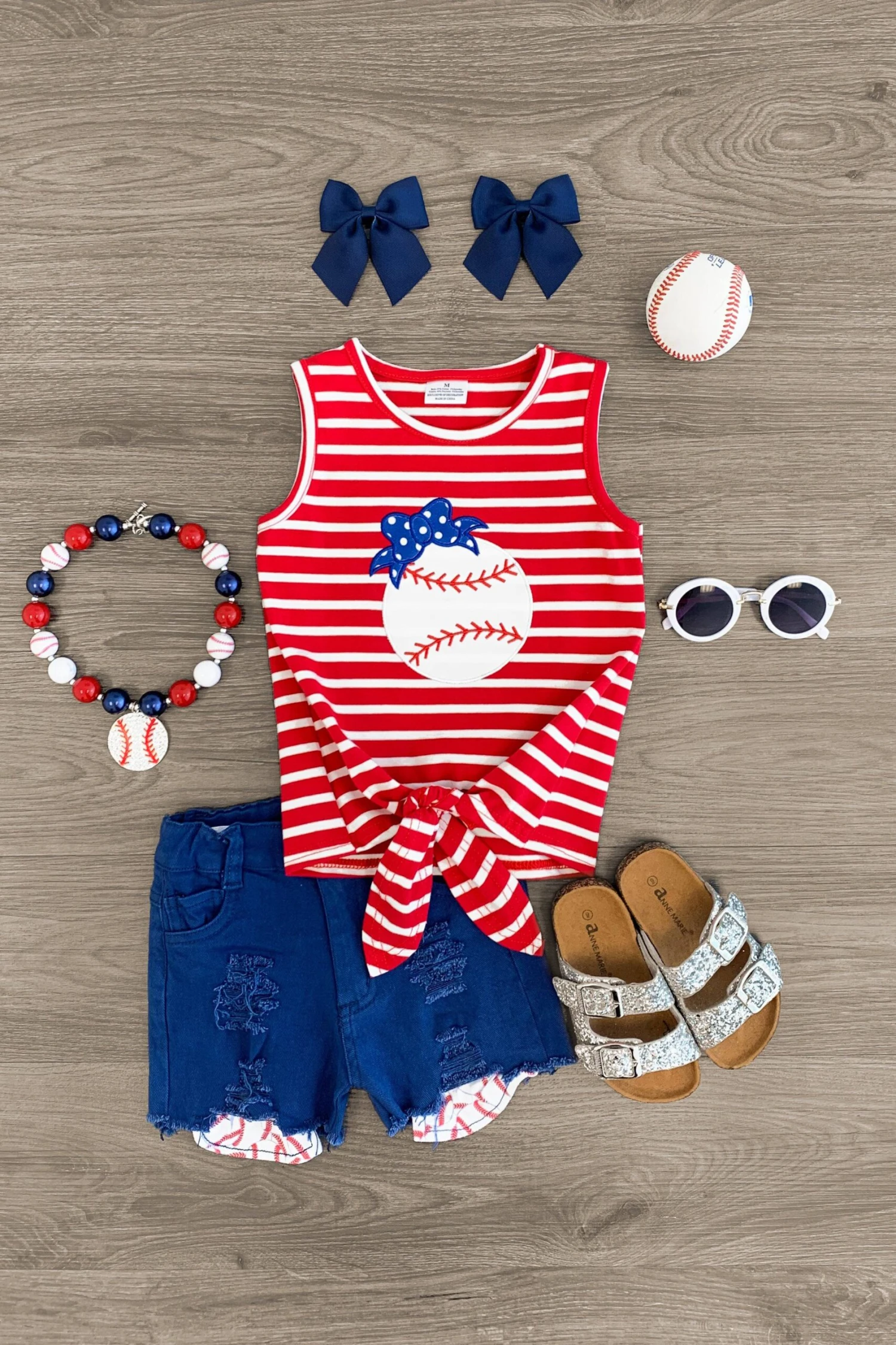America’s pastime just got an adorable touch with this Red Striped Baseball Blue Denim Short Set for girls. This set features a red striped tank top with a baseball design and a feminine tie waist. This top looks adorable paired with the matching blue denim shorts. The stretchy waistband helps comfort and fit and can be great for on the go. The tie top design keeps your little one looking like a dream. The top and shorts can be worn as a set and paired with our bows or keep it laid back with a pair of sunglasses, she’ll shine bright in this kids ensemble.