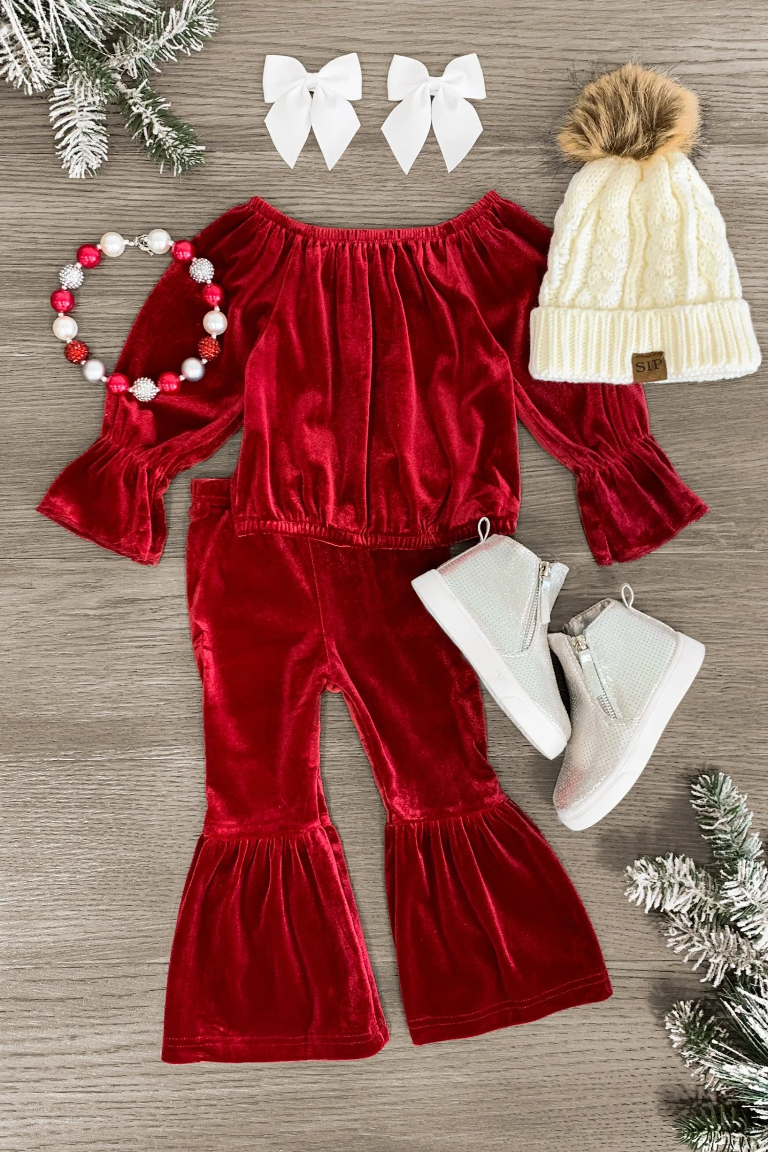 Bring on the colder season with this Red Velvet Bell Bottom Set. The red velvet long sleeve top looks adorable paired with the matching bell bottoms. The stretchy waistband helps comfort and fit and can be great for on the go. The top and pants can be worn as a set and paired with our SIP bows or keep it laid back with a pair of booties, she’ll shine bright this holiday season.