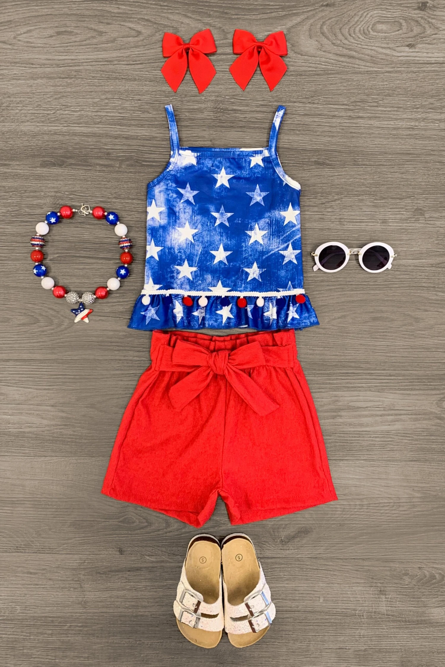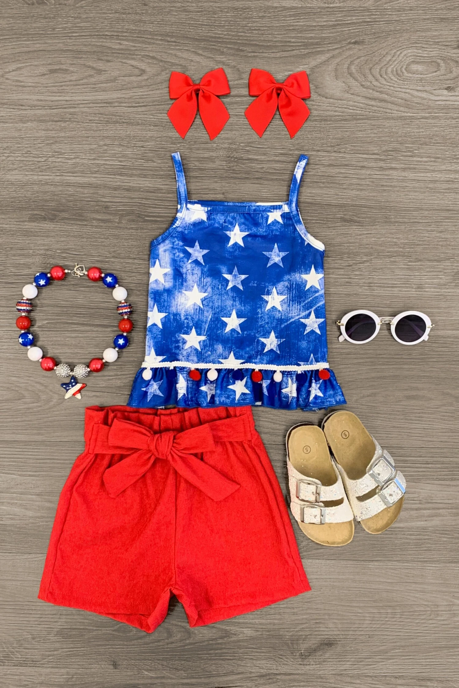 Add sweet fluttery style to her look with this Red White Blue Pom Pom Corduroy Short Set. This girls’ set is styled with a star print top making it a staple addition to her summertime wear. The top is paired with matching red corduroy shorts with a tie waist adding feminine flair. The stretch waistband provides a secure fit, and the ultra soft fabric provides all day comfort. She can pair this set with sandals or our fun bows for the perfect look!
