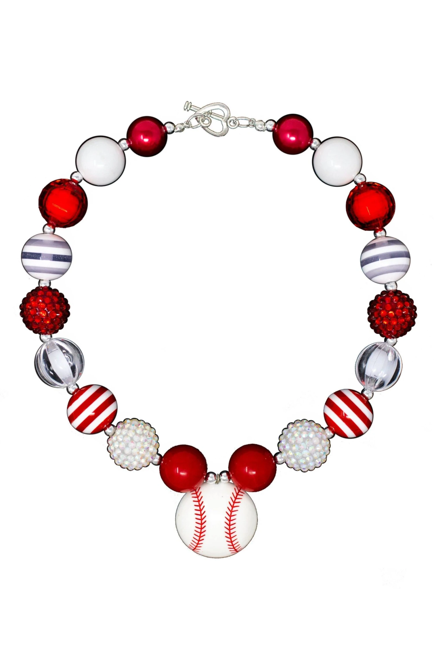 For the girl who loves to cheer on sports, this Red & White Baseball Necklace makes a perfect addition to her jewelry collection. This girls’ necklace features a baseball pendant dangling from a red & white beads she’ll love. This necklace works just as well with her dressy ensembles as with a jeans and tee combo.