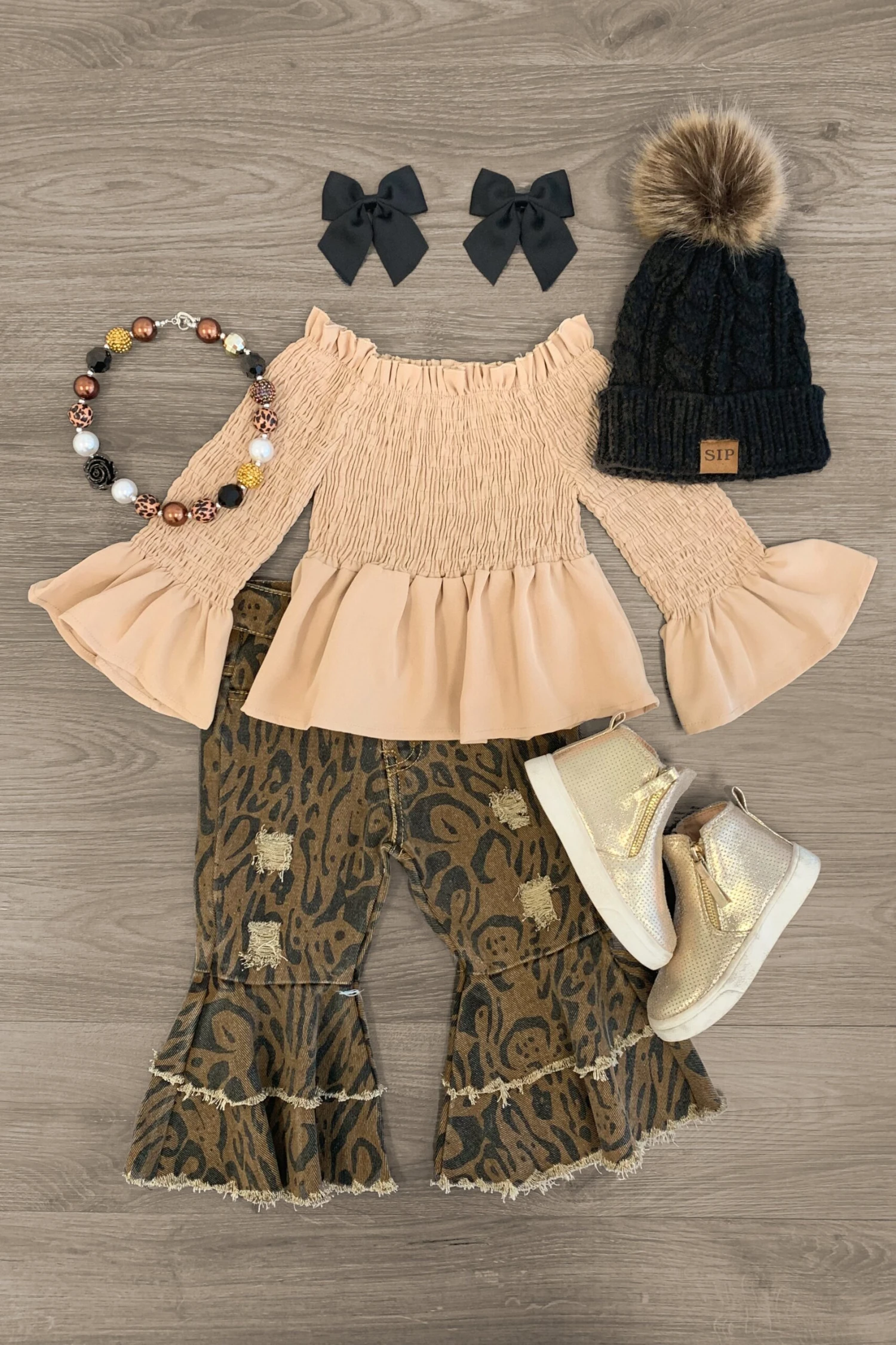 Bring on the cooler months with style in this Ruched Brown Cheetah Ruffle Bell Bottom Set. This set features a tan feminine ruched top and bell sleeves and matching bell bottoms. The chiffon-like top is made from an ultra-soft material, and looks adorable paired with the animal print ruffle bell bottoms. The top and pants can be worn as a set and paired with our matching bows or keep it laid back with a matching necklace, she’ll shine bright in this kids ensemble!