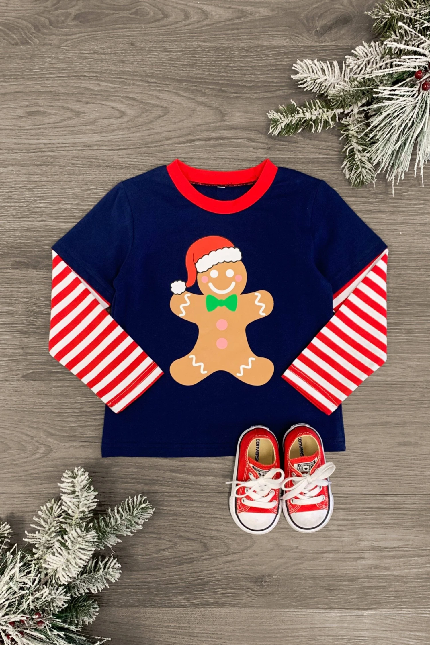 This Santa Gingerbread Man Stripe Top features long sleeves, and a festive Santa gingerbread man design on the front. In a navy & red stripe design, this top is made from soft and breathable fabric that will keep your little one comfy during all adventures. They can pair it with a variety of bottoms for the perfect look! Check out our boys’ collection for more tops like this one!