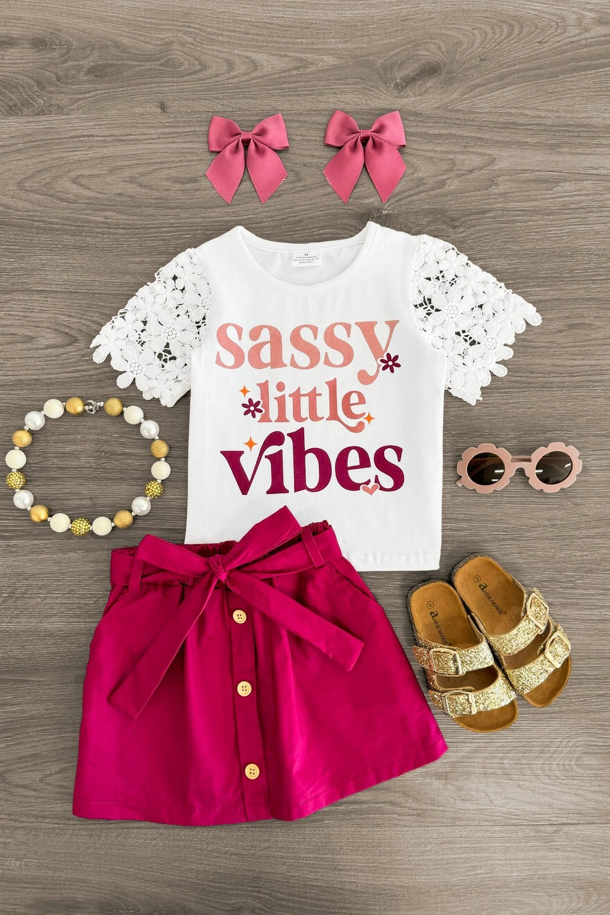 Add sweet fluttery style to her look with this “Sassy Little Vibes” Skirt Set for girls. The white top features floral lace sleeves with a cute saying on the front and looks adorable paired with the matching skirt. The stretch waistband provides a secure fit and allows for all day comfort, while the belt adds a nice touch. She can pair this set with sandals or our fun bows for the perfect look!