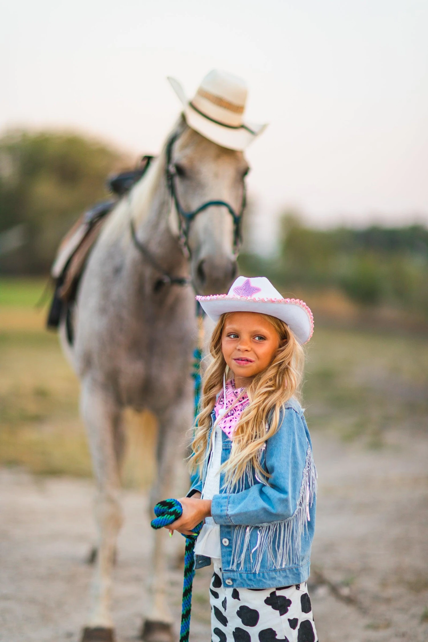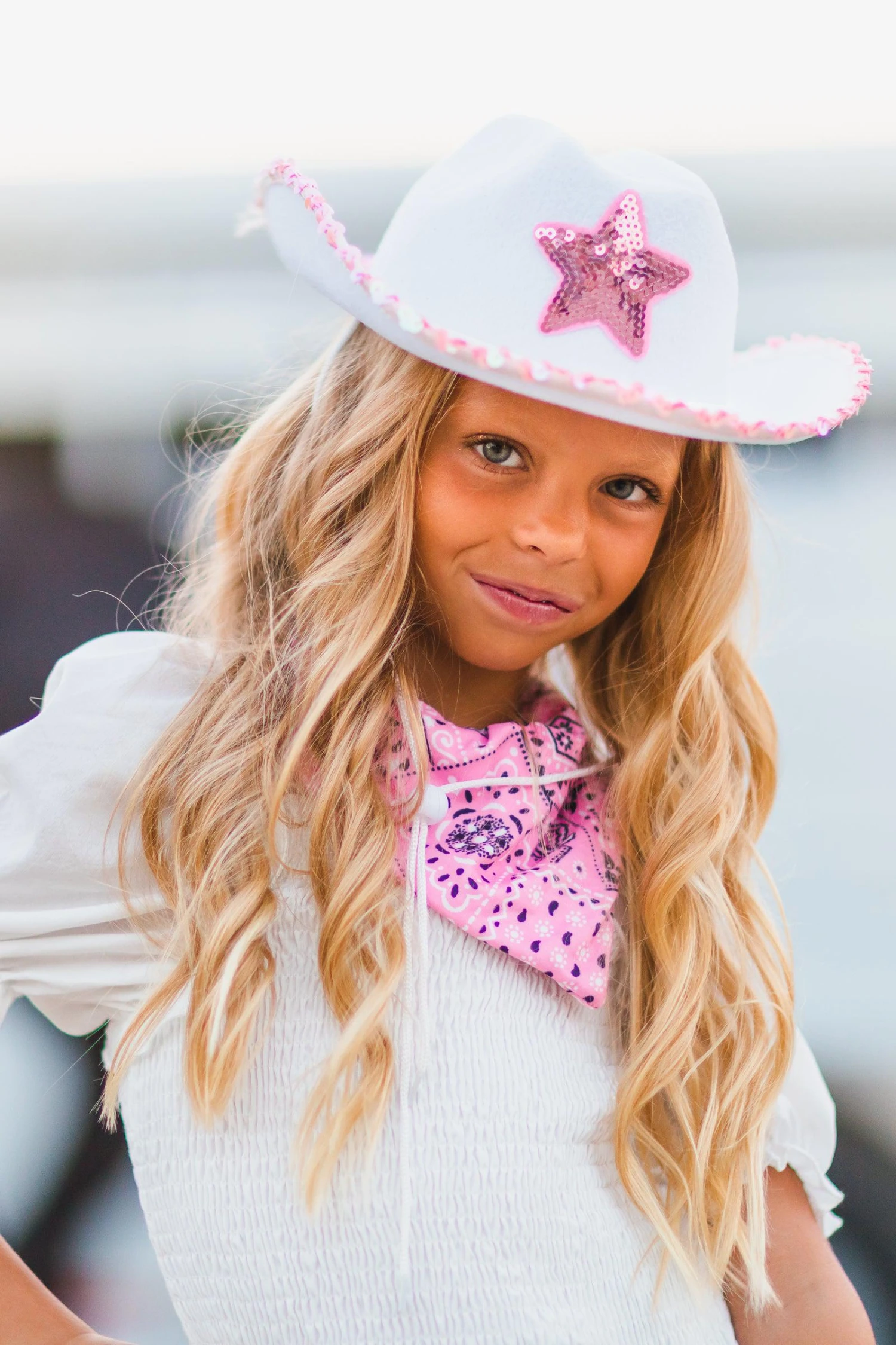 Add fun flare to your little girl’s wardrobe with this kids Sequin Star Cowgirl Hat. Featuring an allover white design with pink sequins on the brim and a star on the front, your little girl will love rocking this cowgirl hat. The hat pairs perfectly with our Cowgirl “Lets Go Girls” Silver Fringe Denim Jacket & Cowgirl Costume or she can easily pair it with many pieces to create fun outfits.