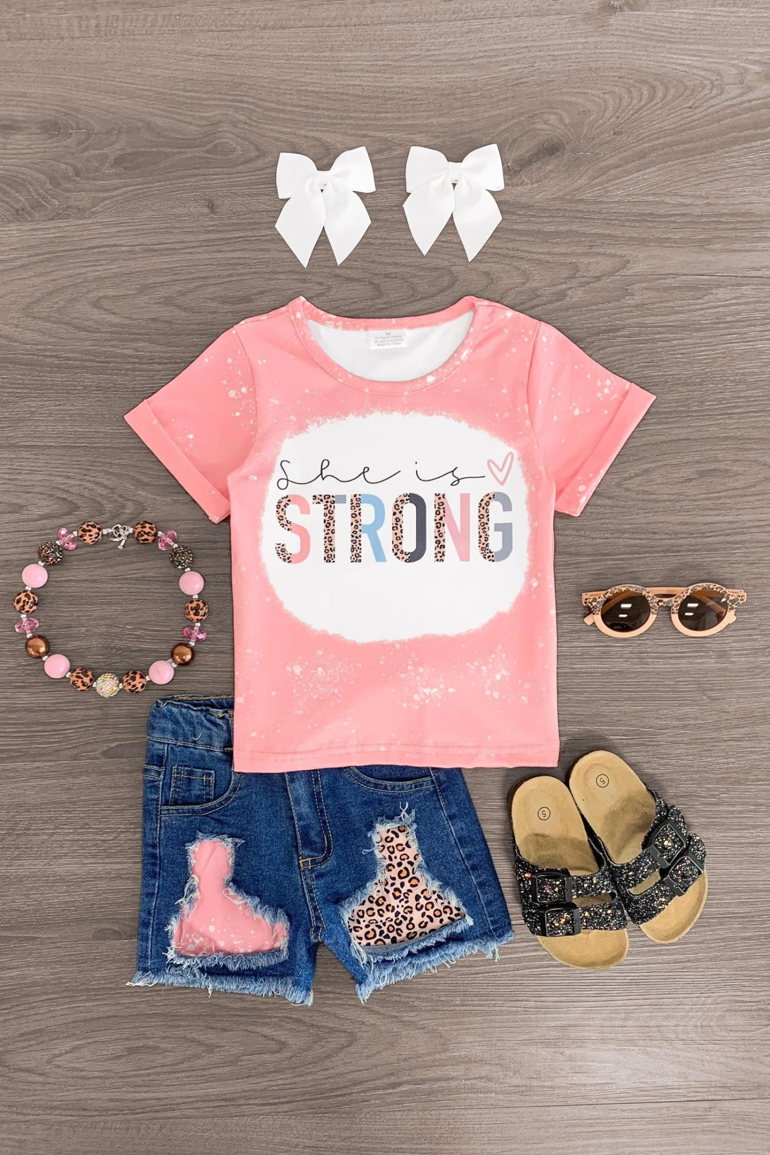 Bring on the warmer months with this “She Is Strong” Pink Denim Short Set for girls. This set features a pink top with a short sleeve design & cute saying on the front. This top looks adorable paired with the matching denim shorts. The stretchy waistband helps comfort and fit and can be great for on the go, while the distressed design adds the perfect pop to her look. The top and shorts can be worn as a set and paired with our comfy sandals or keep it laid back with a pair of sunglasses, she’ll shine bright in this kids ensemble.