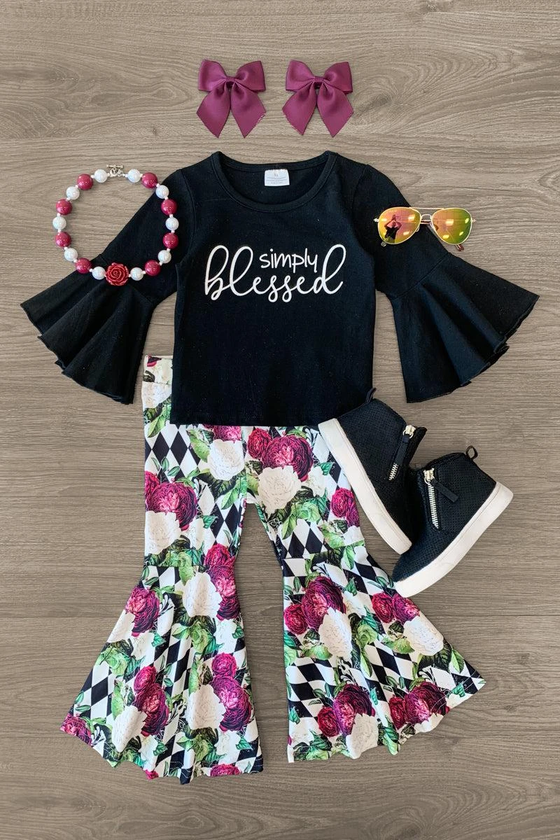 Bring on the cooler weather with this “Simply Blessed” Bell Bottom Set for girls. This long sleeve top looks adorable paired with the checkered & floral print bell bottoms. The stretchy waistband helps comfort and fit and can be great for on the go. The top and bottoms can be worn as a set and paired with our SIP bows or keep it laid back with a pair of booties, she’ll shine bright in this kids ensemble.